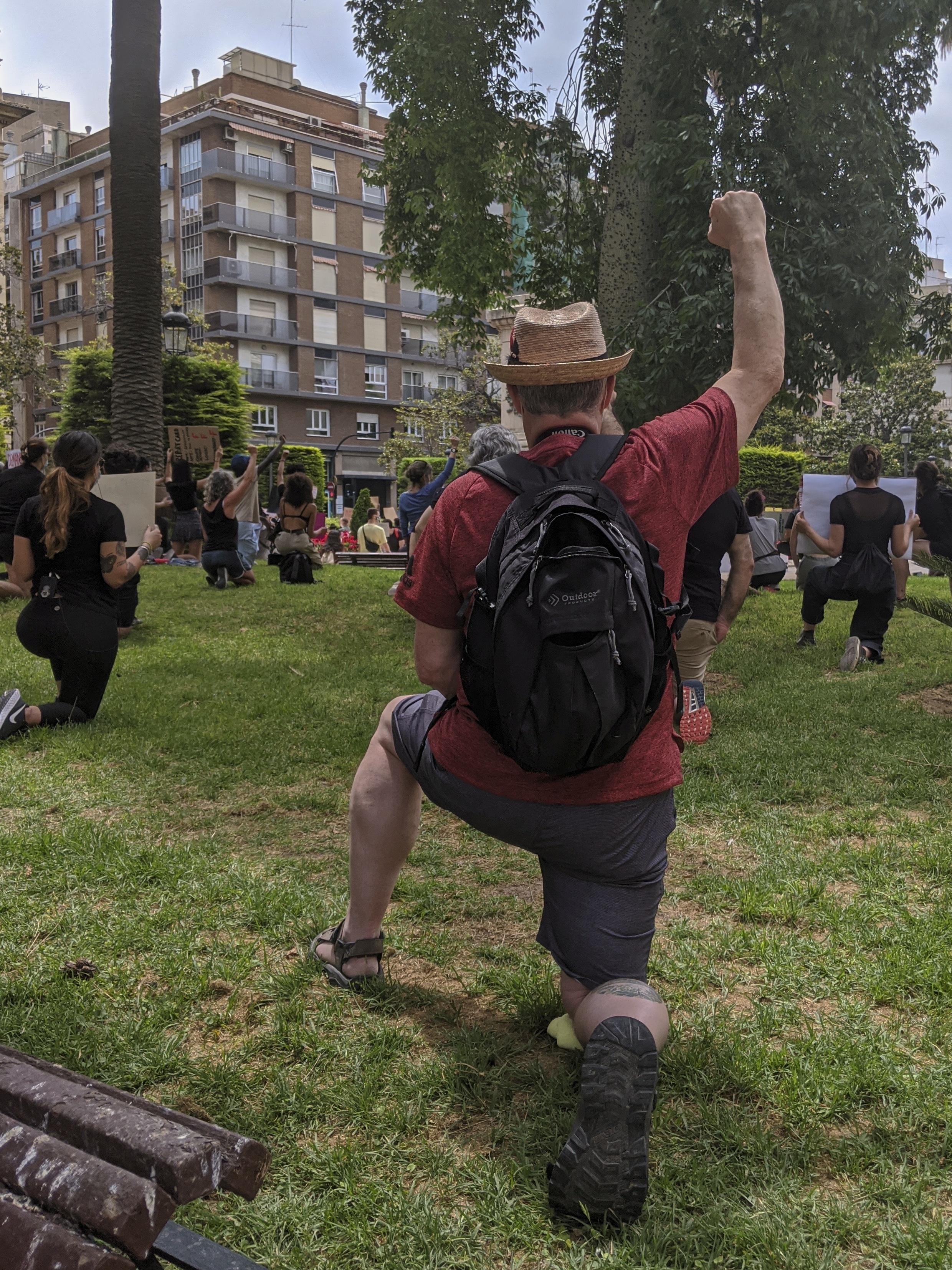 We attended a Black Lives Matter demonstration here in Valencia today. Part of it involved kneeling in silence for nine minutes in honor of George Floyd. Try it. Try kneeling in one place for nine minutes; maybe raise a fist in solidarity. At the end of nine minutes, you’ll be in agony. Your knee will hurt, your shoulder will ache. After a certain age your back will hurt too. For me, it was the longest nine minutes I’ve experienced in some time.