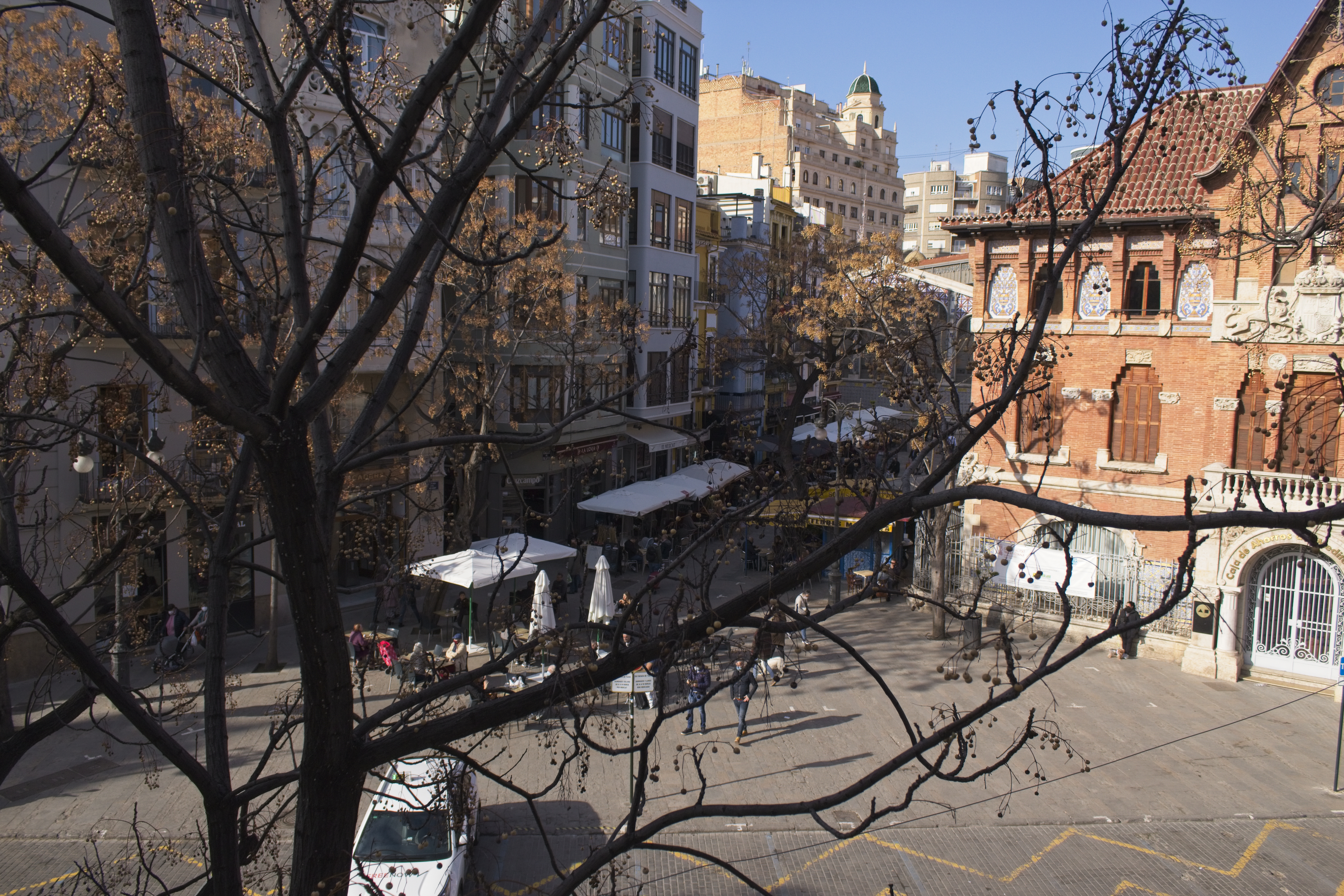The plaza outside the windows. The pop-up tents for diners follow the plaza to the Central Market
