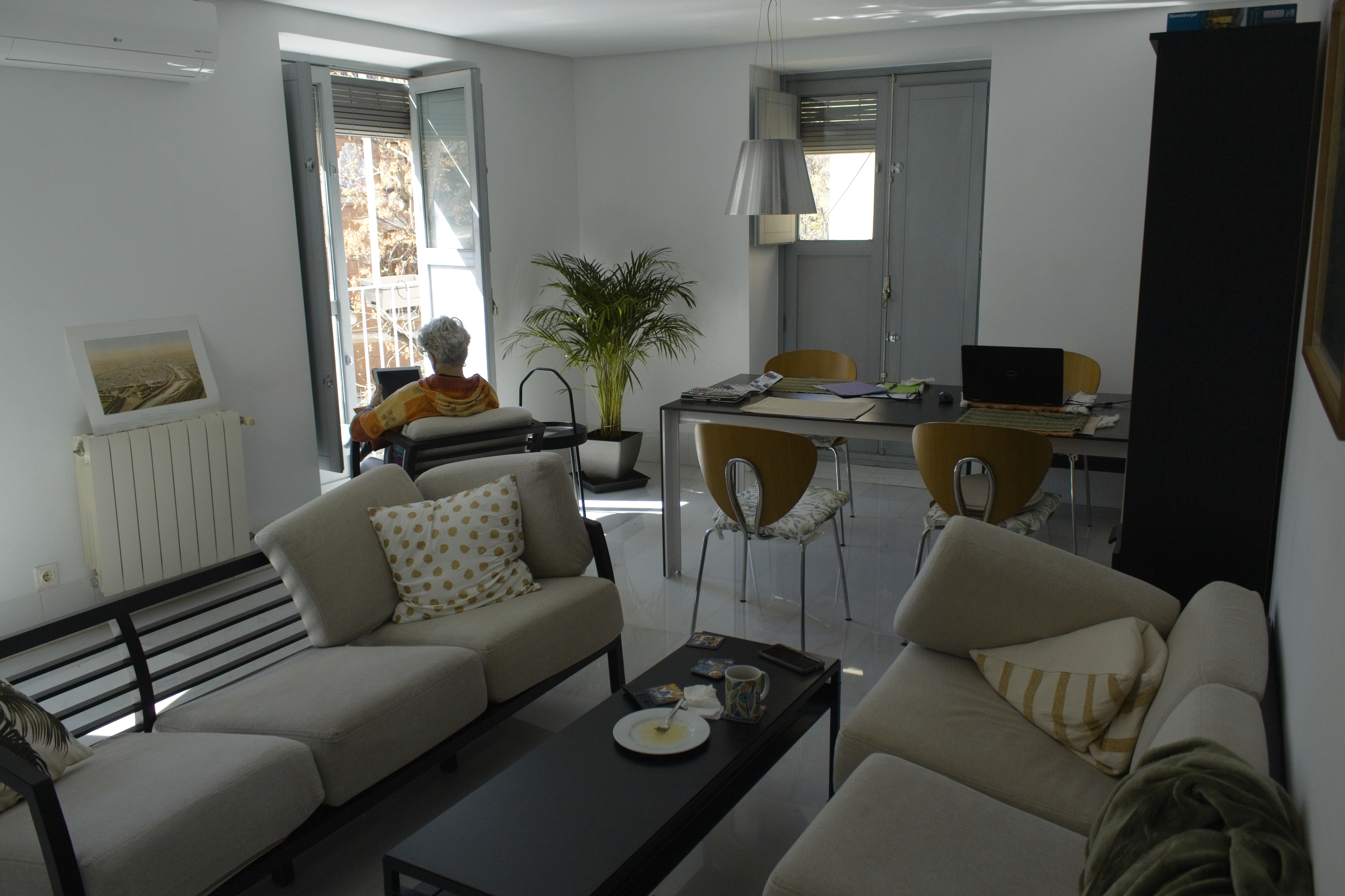 The living/dining room, and a hint of the french doors opening onto the plaza