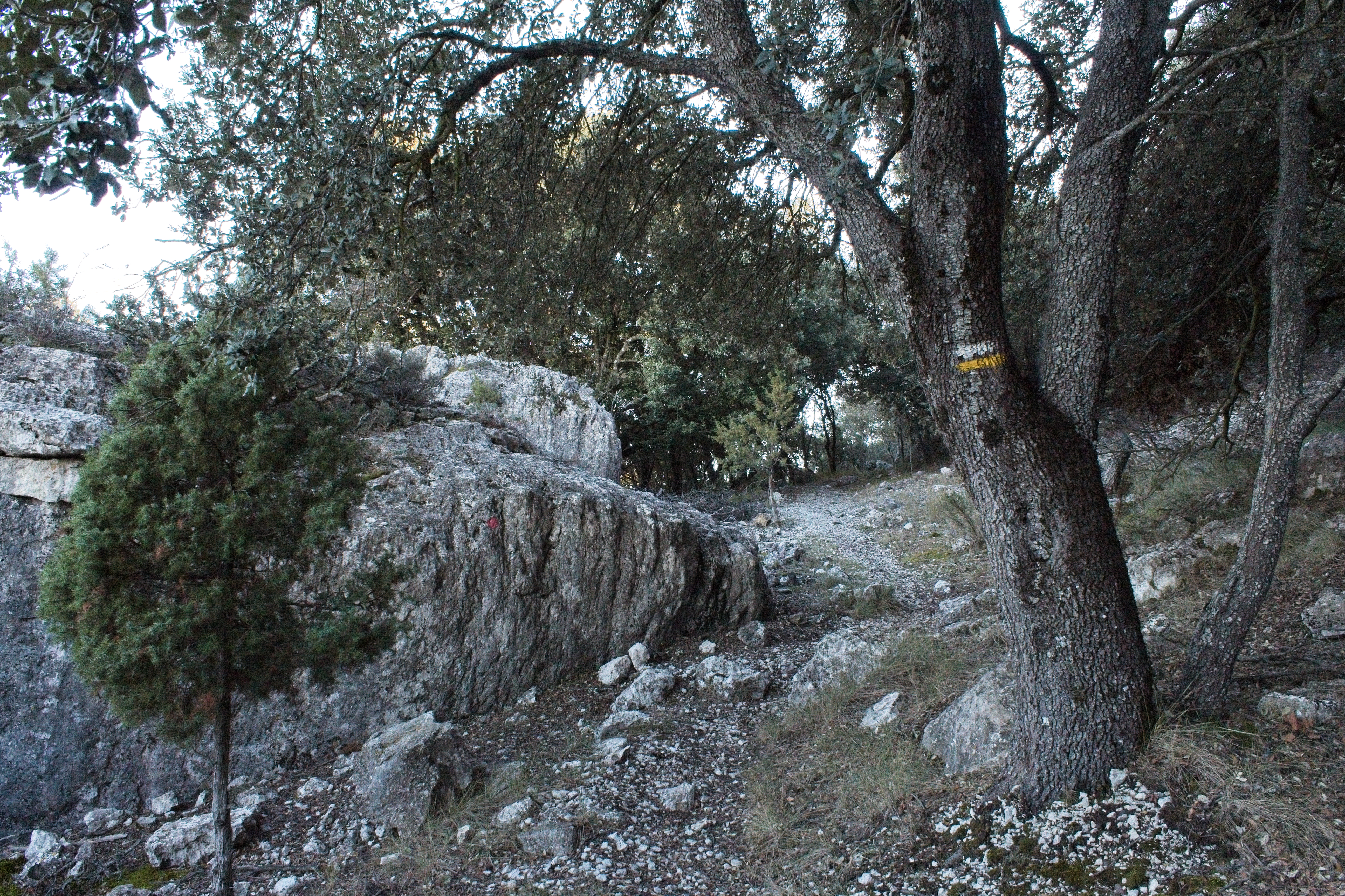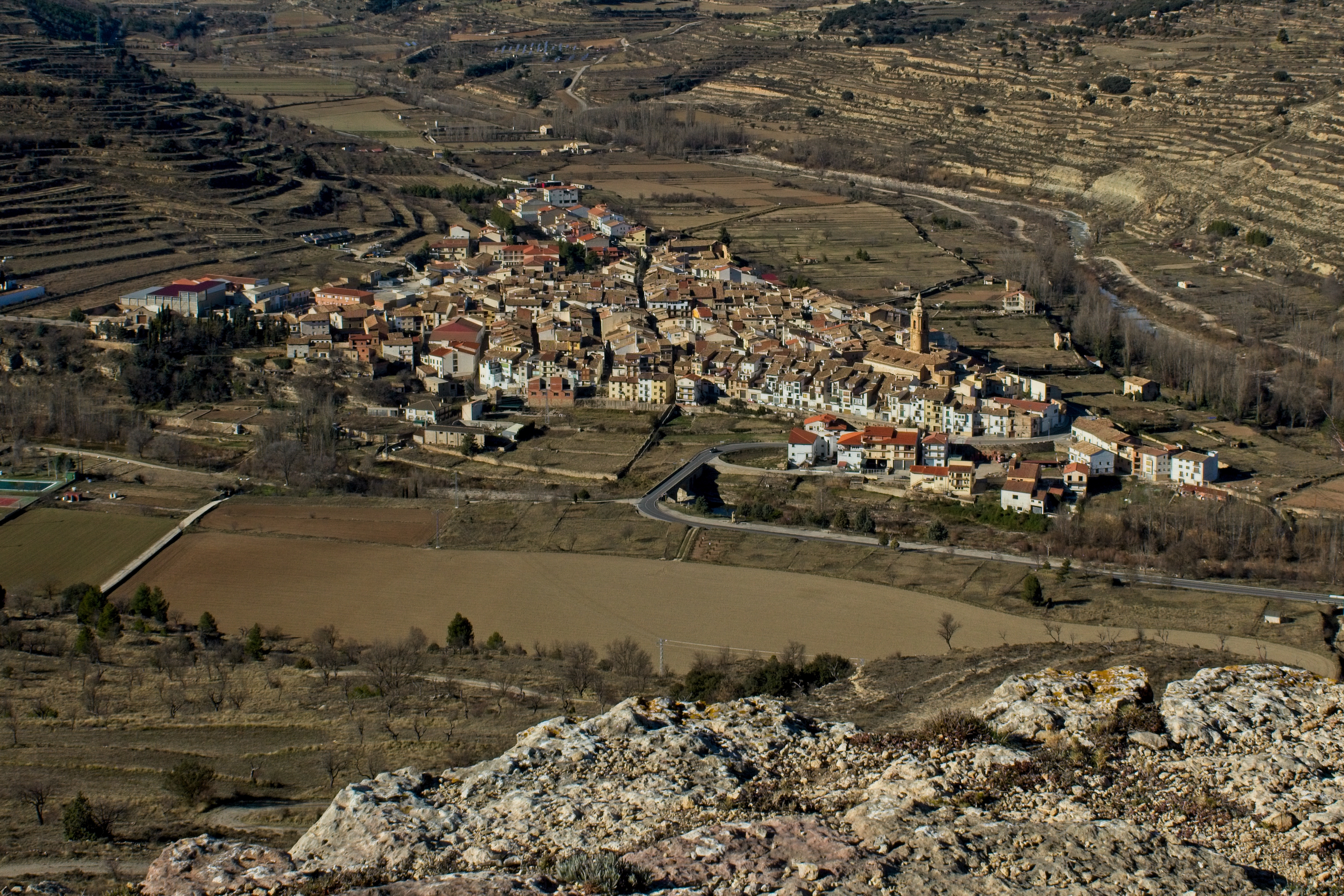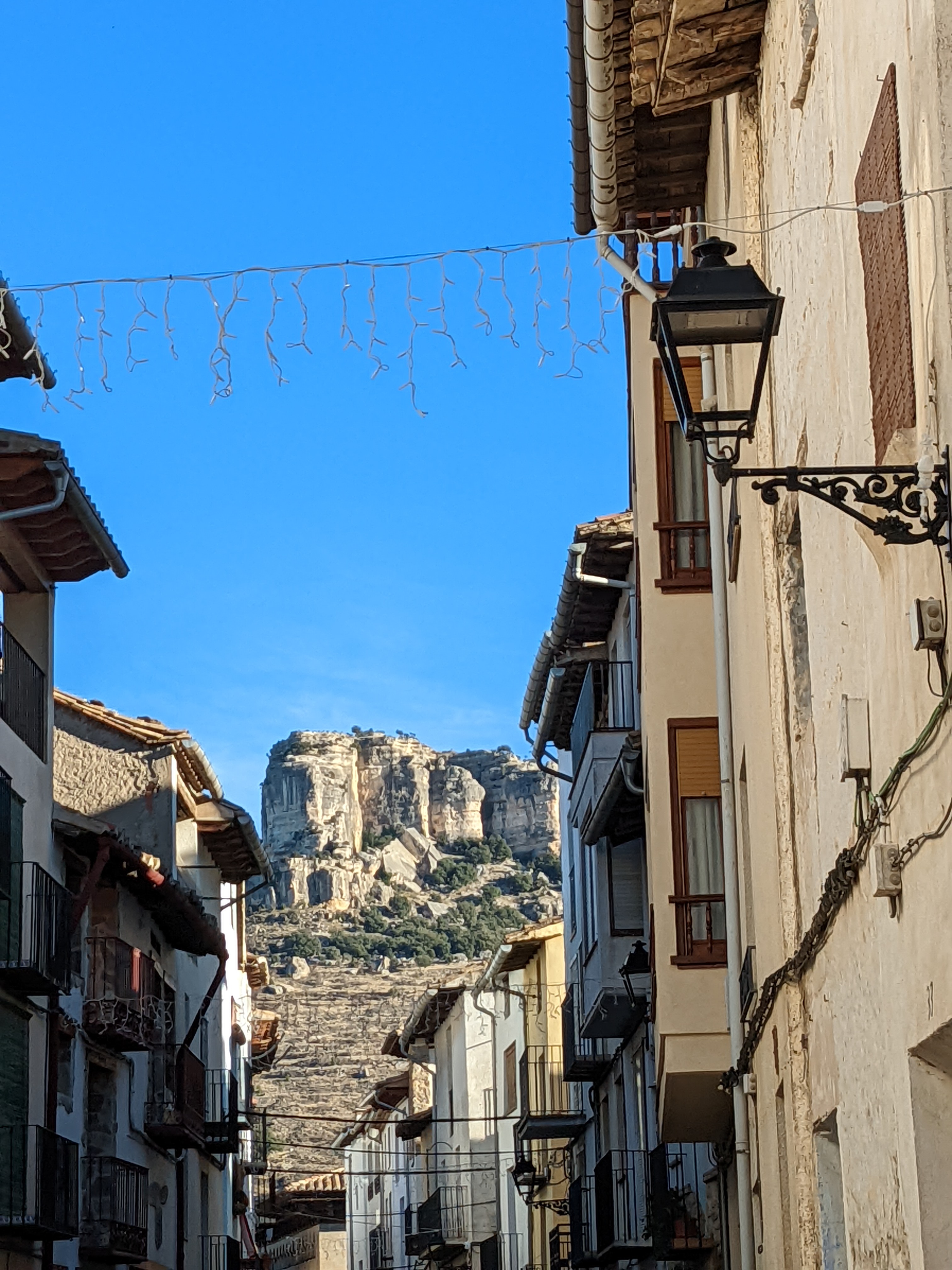 We arrived in Forcall (for-caya), a neighboring town at the confluence of the Cantavella and Calders rivers, that was the only place that had hotel space for us, late in the afternoon of New Year’s Eve. After getting settled in, we went out seeking hiking grub for the next couple of days. The “supermarket” in the town of 450 souls was closed for the weekend so we hopped back into the car to make a drive up the highway to the nearest larger town, where the market was also closed. Down the road in the other direction we went, to Morella where at least the Consum was open and we got fruit, meat, crackers and some potato chips for the hike.