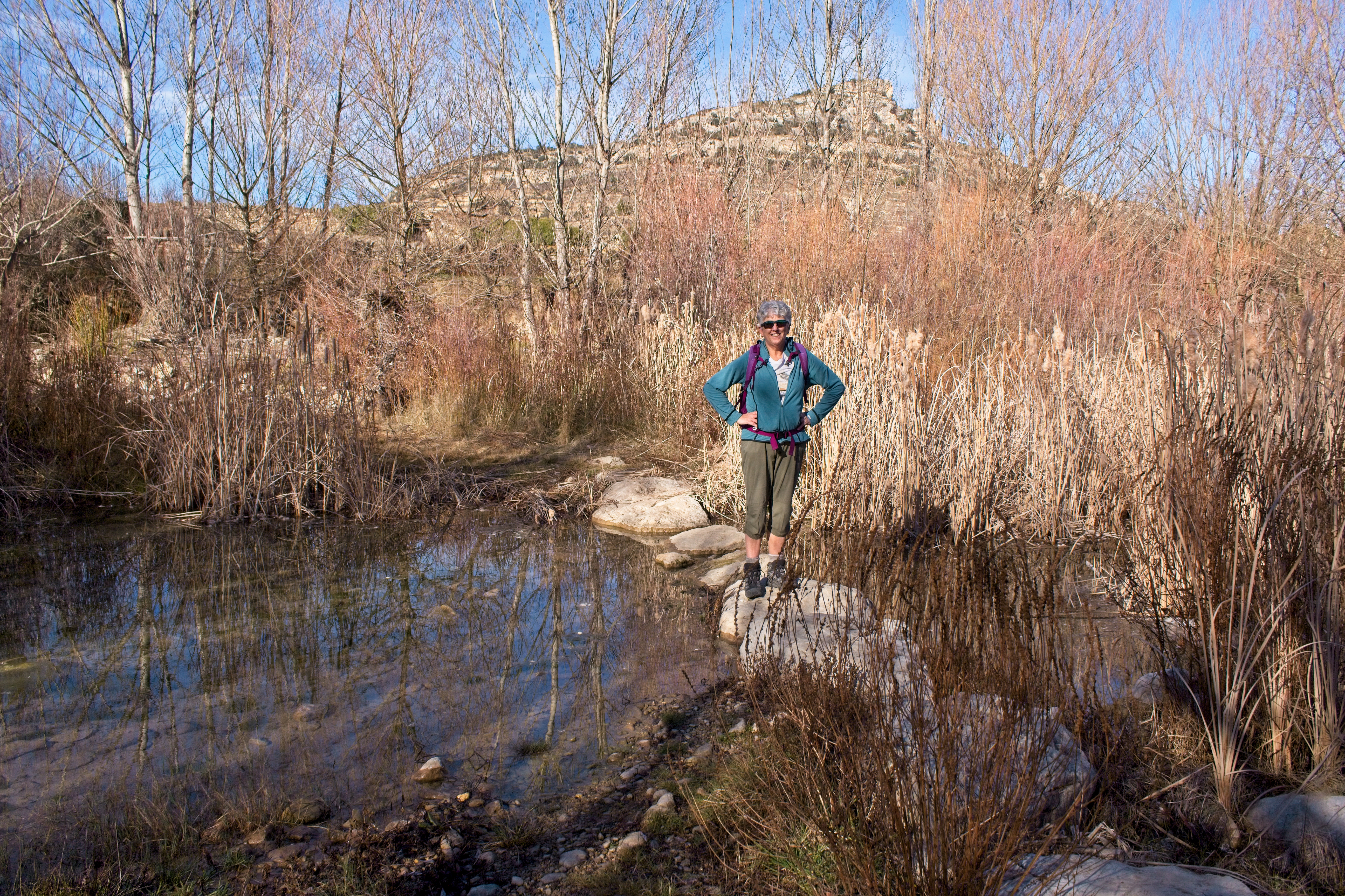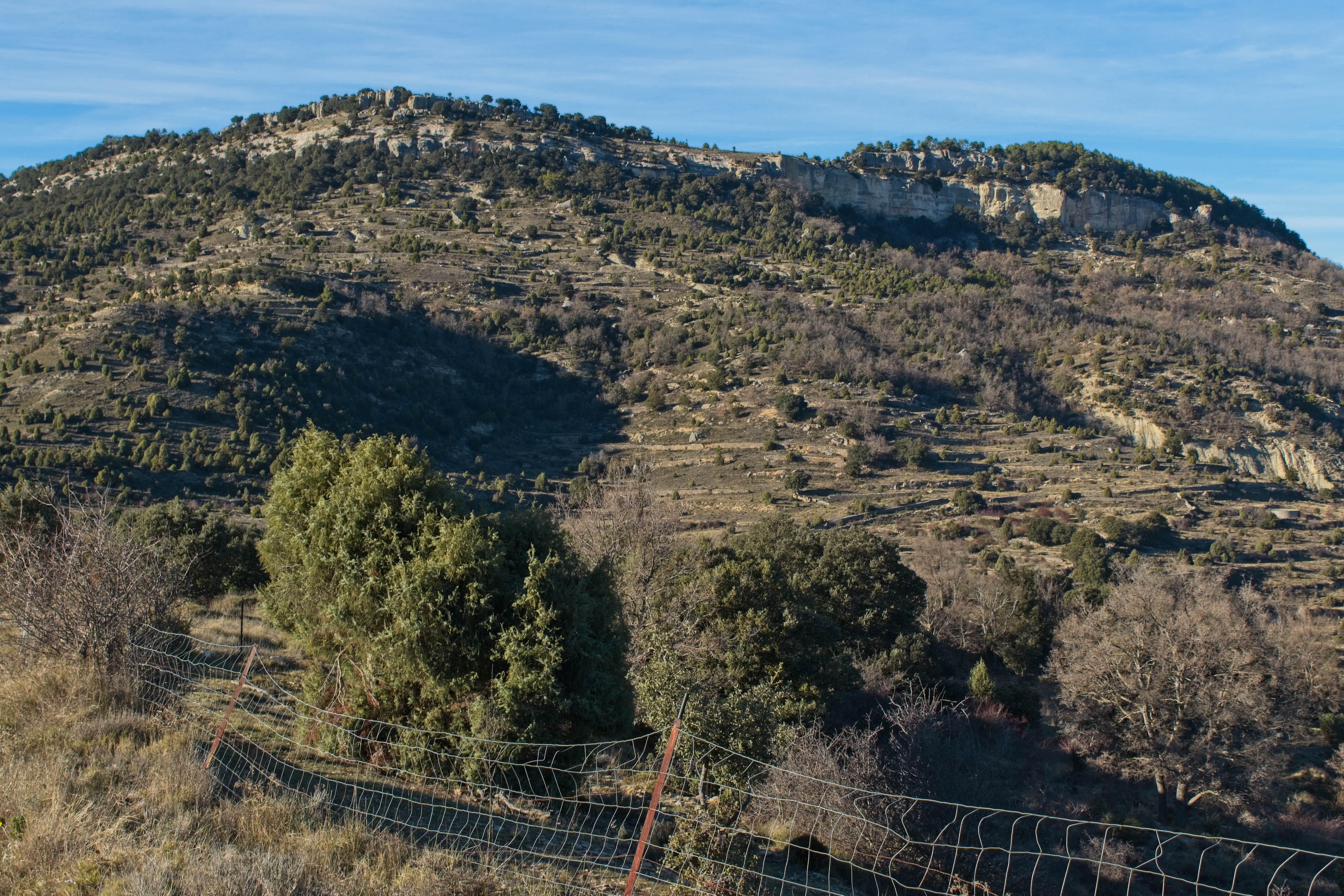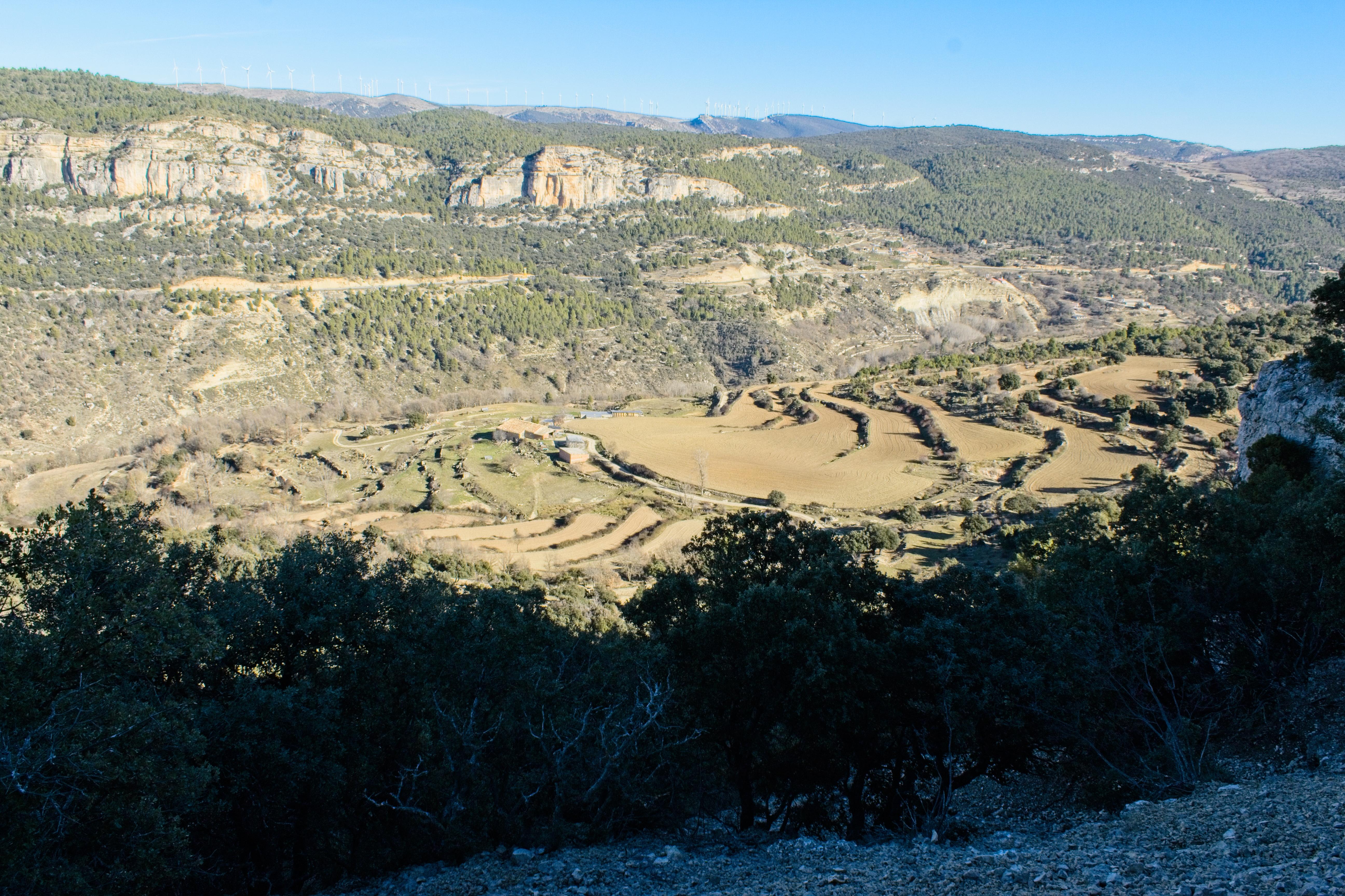 Saturday morning, New Year’s Day, we lazed about a bit in the morning, thinking we had about a 7 mile hike to Morella from the hotel. Breakfast was very nice, a continental-style affair but with fresh loaves of bread (Cindy was even able to get some gluten free), fruit, yogurt, and plenty of coffee. We were off on our hike shortly before noon. Our route took us across the Calders river and then straight up to just below the peak of the neighboring hill that marked the start of the ridge we would follow all the way to Morella.