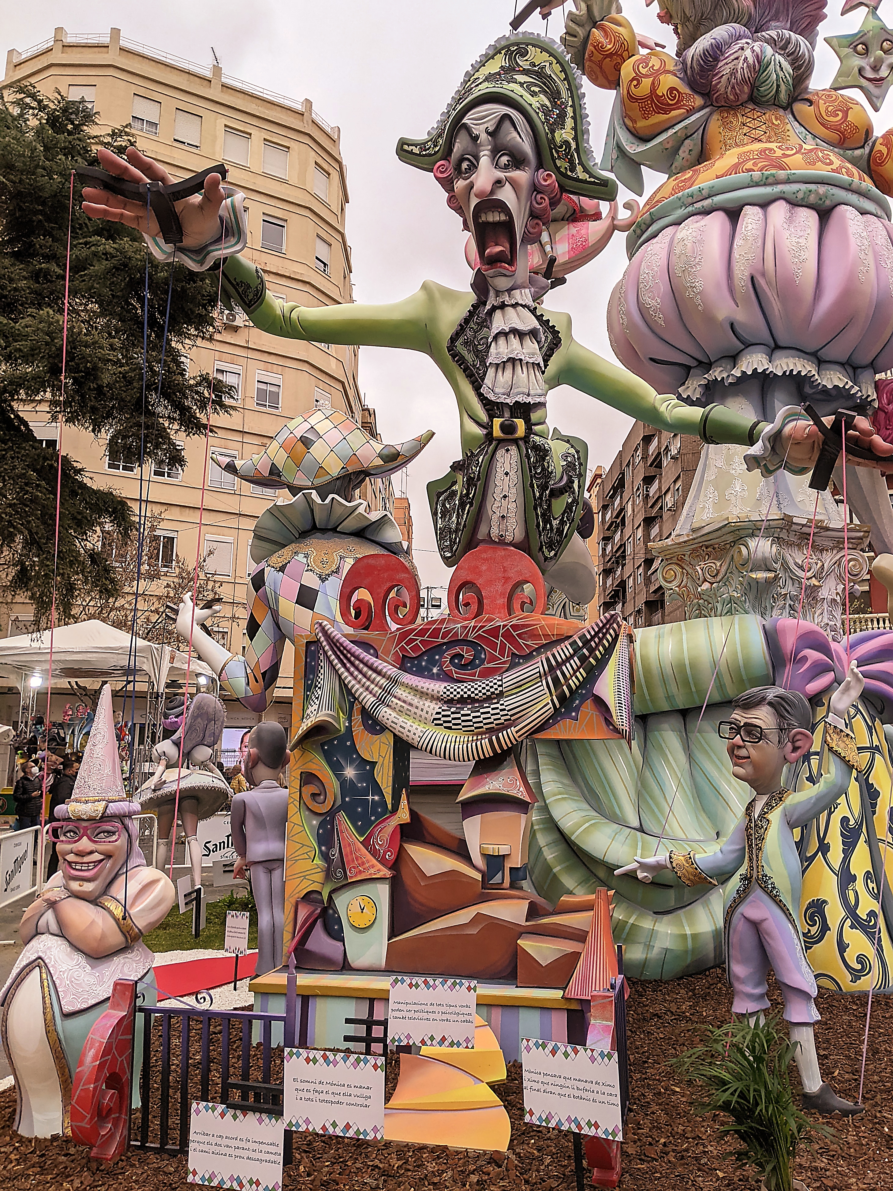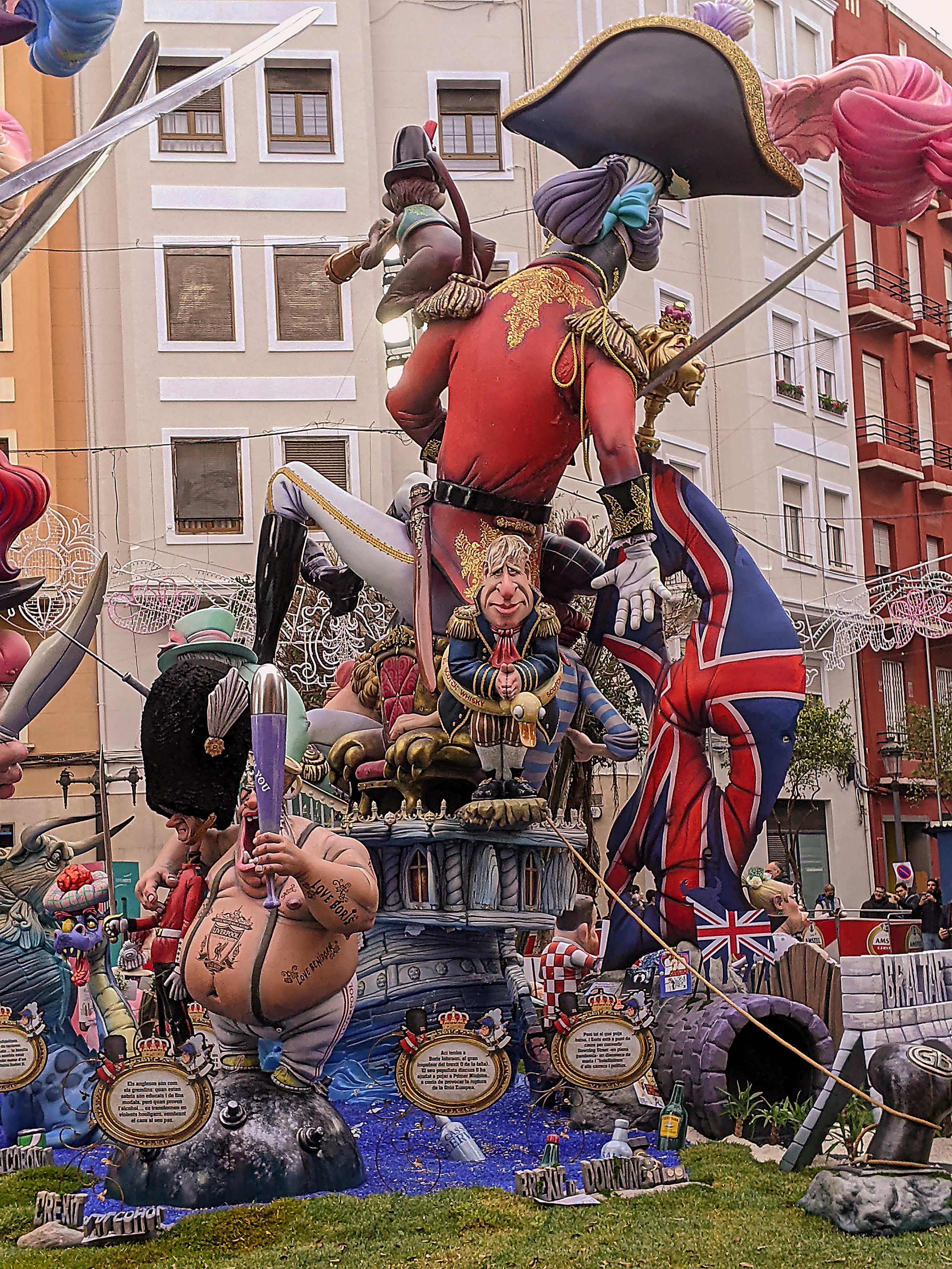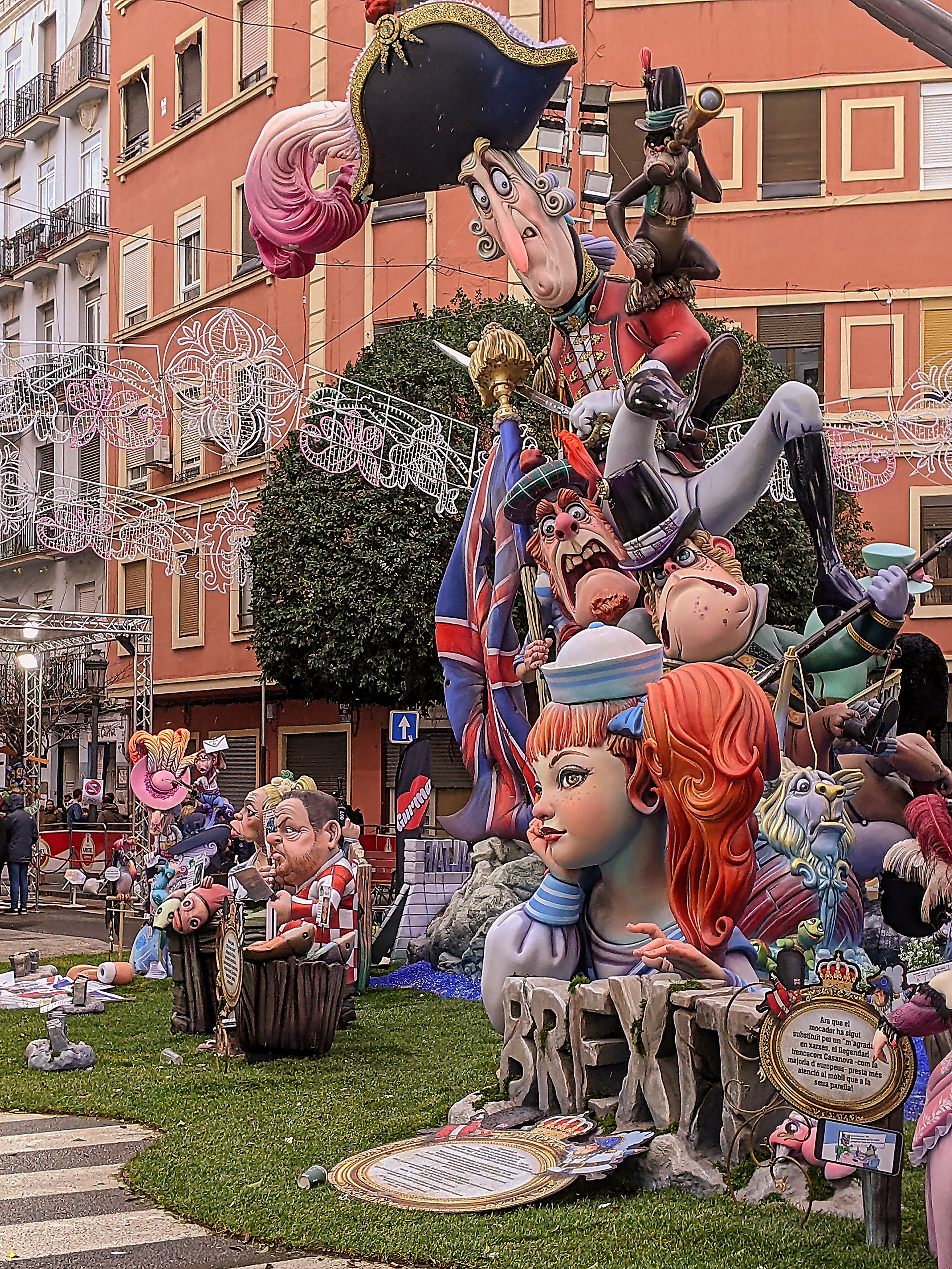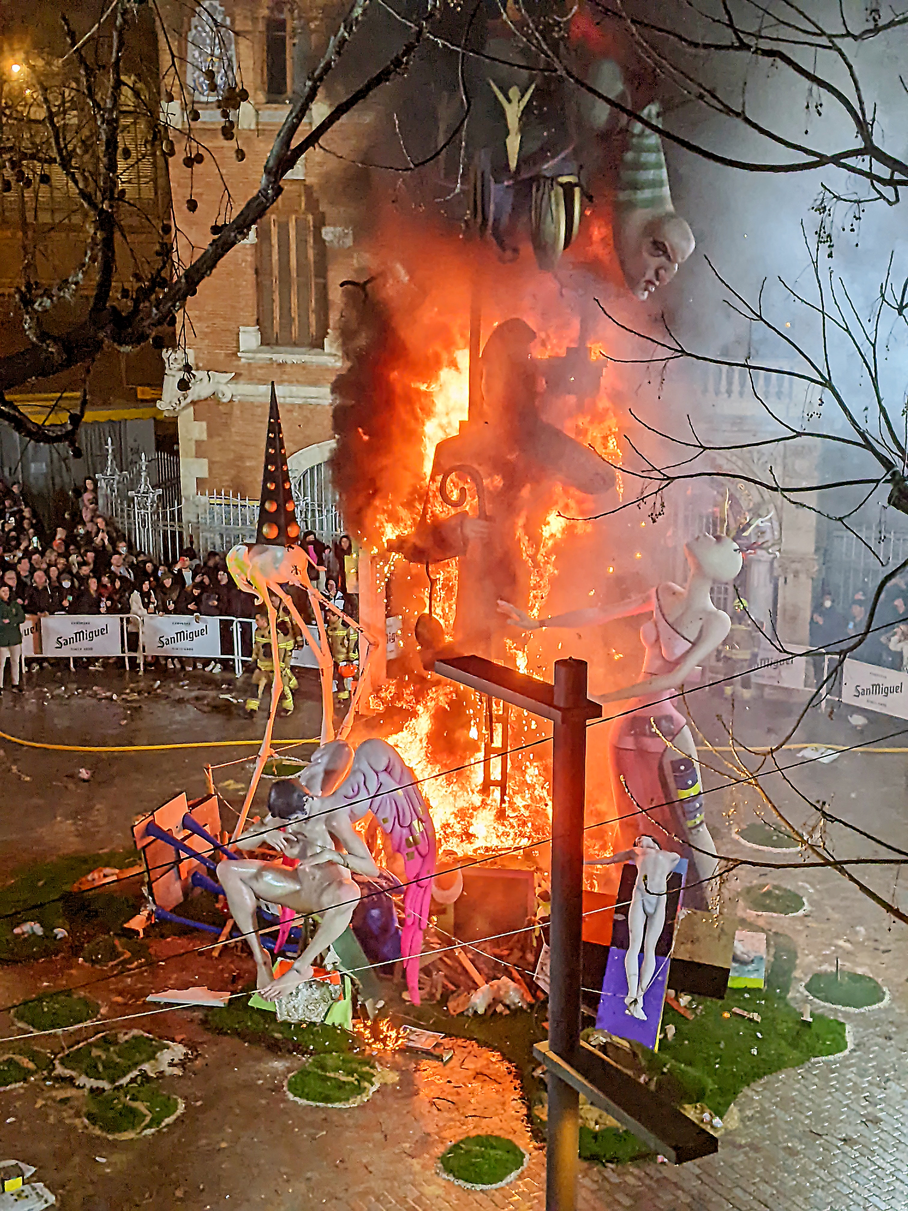 “Our” falla, with a Salvador Dali themeThe detail work on the sculptures can be amazingSponsored by a gaming / gambling company, go figureThis was the biggest falla in the city this year, standing some 5 stories tall and chuck-a-block with imagery.Every day at 2:00 in the Plaza D’Ayuntamiento there’s a “mascleta” or sound show using fireworks. There are also nighttime fireworks. All events are incredibly well attended.The fallas all have a message, usually overtly political. The placards add some context to the sculptures, sadly they were all written in Valenciano which I cannot read so some of the messages were obscured.It’s a safe guess that the puppets are local or national political figures. The puppeteers? I’m guessing Europe but I don’t really know.You can get lost in the details.This fella should be recognizableThe sculptures are made with wood framing and styrofoam to create the shapes and then painted with acrylic. When they burn, it creates a black cloud of nastiness. This year a few sculptures were made from paper, clearly an experiment in a greener Fallas for the future.Commentary on Brexit. Much is being said here, not terribly complimentary to the British or the EU.Brits on the left, EU on the rightBoris and a soccer fan make an appearanceAnother environmental theme, this one lamenting the pollution of l’Albufera, the lake and farmland just south of the city from which much of the rice for paella comes.Given that they’re about to light this guy on fire, the level of detail displayed here is remarkableLa Virgen, unfinished. The Church erects and places the white and red flowers in the structure. Each of the fallas groups throughout the city then bring an offering of flowers ahead of St. John’s day.The big night has arrived! Crowds gather in all of the squares with fallas to watch la Créma, when the sculptures are set on fire. In theory it all takes place just before midnight but in practice each of the big fallas requires a fire crew to attend and keep everything safe. Our falla, at the center of town, didn’t burn until about 1 AMThe children’s falla was lit first, this was at about 11:00Fireworks are used to set the fire, after the falla is partly destroyed and the parts piled into the middleAnd up she goesUntil next year!