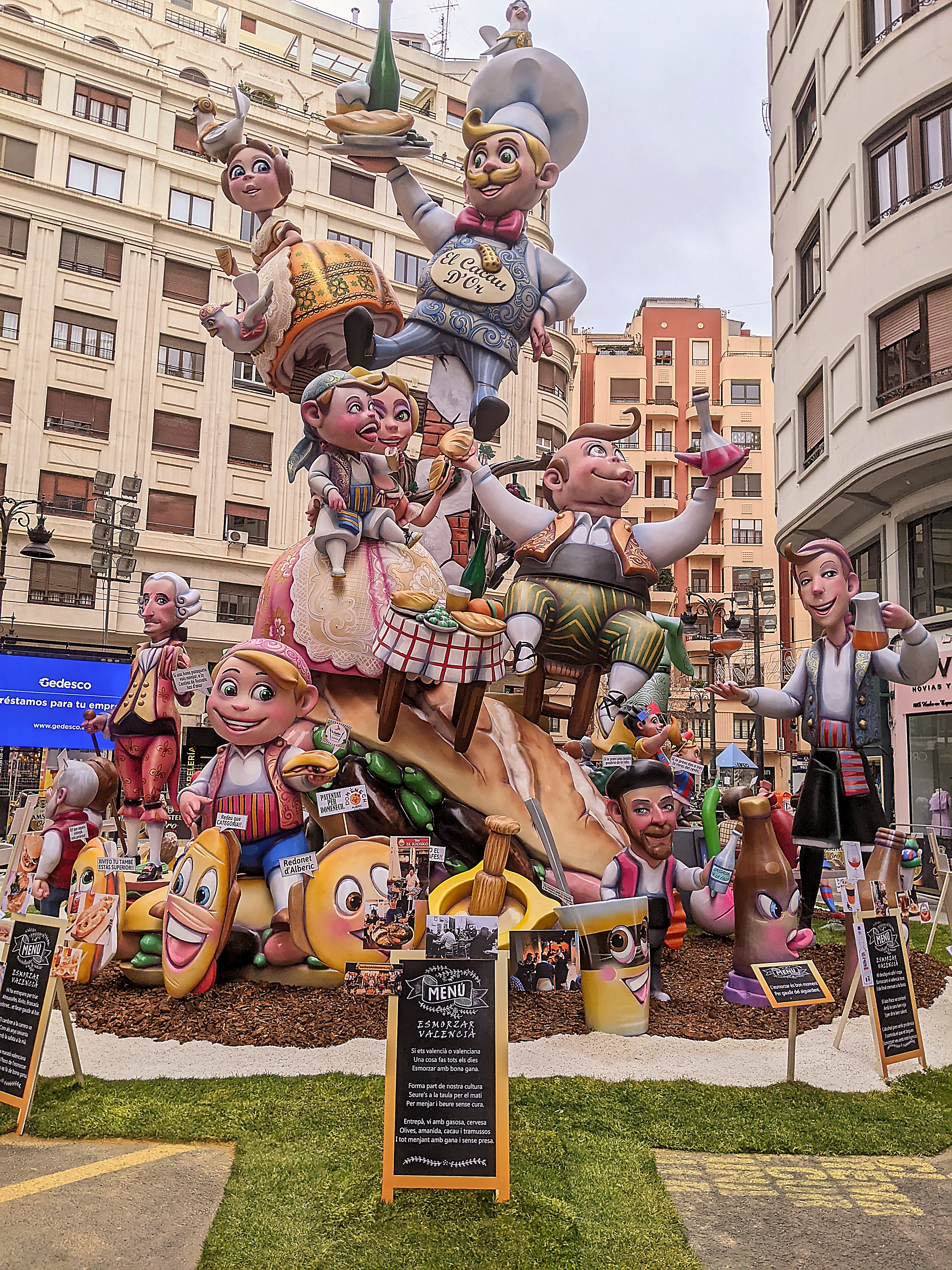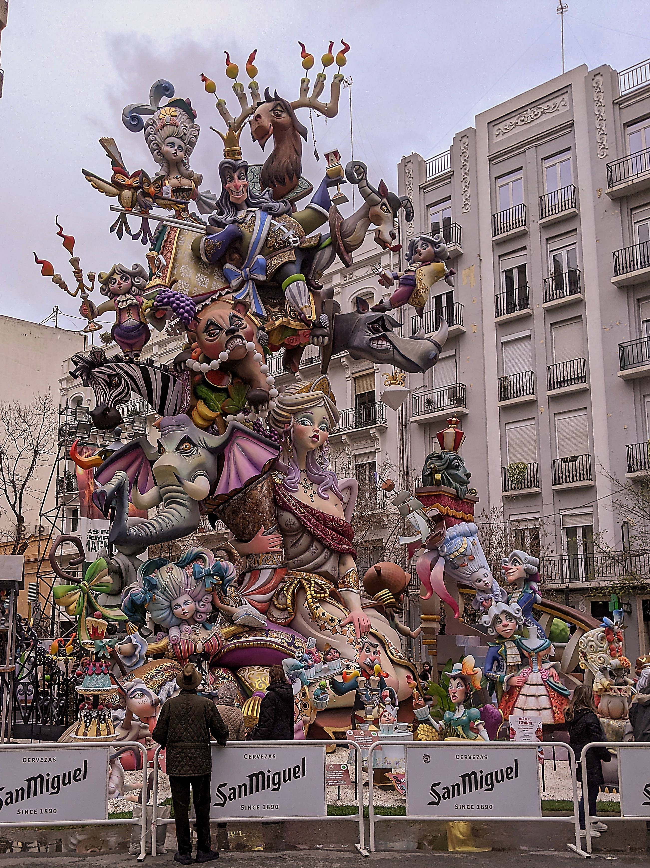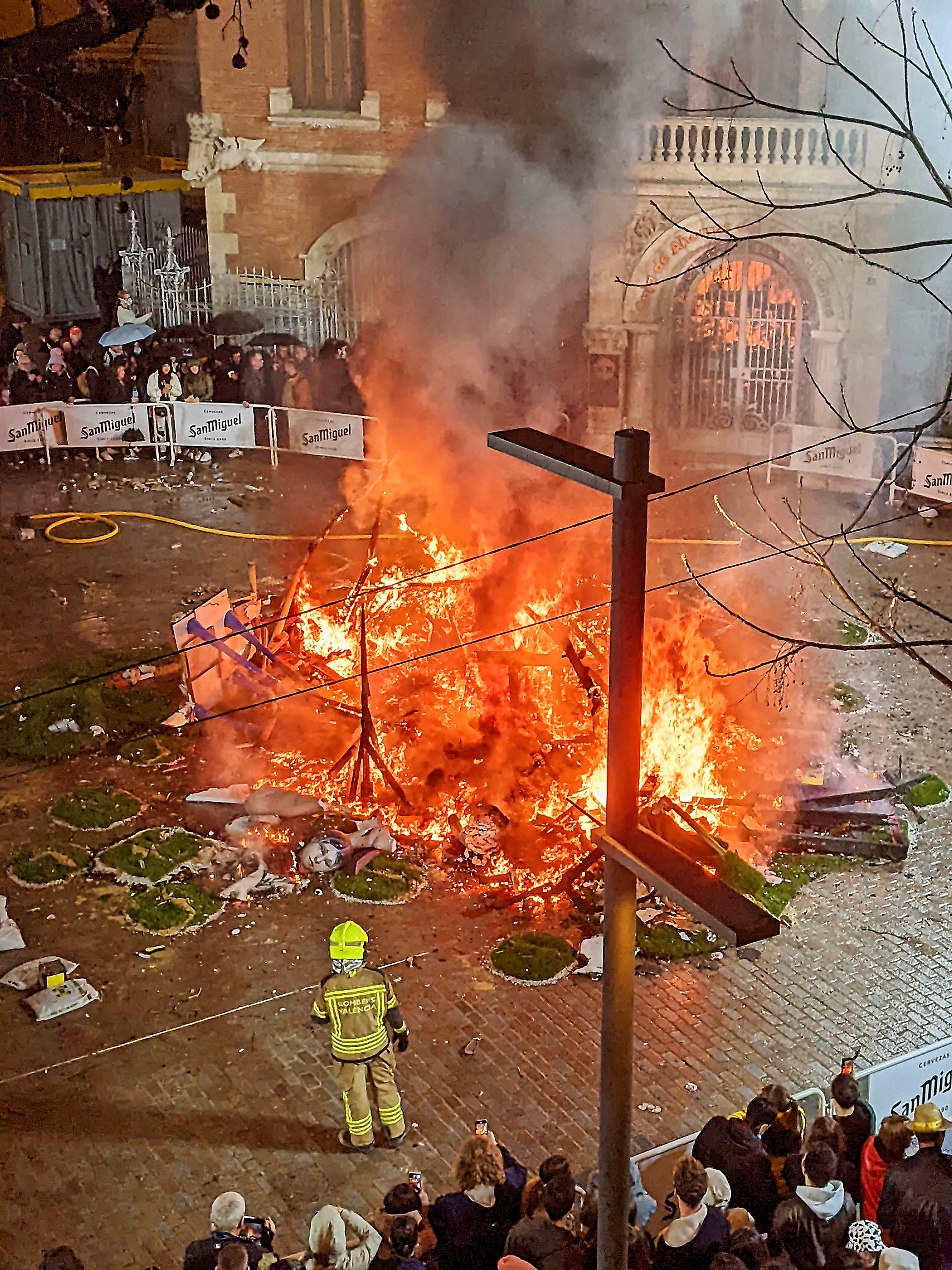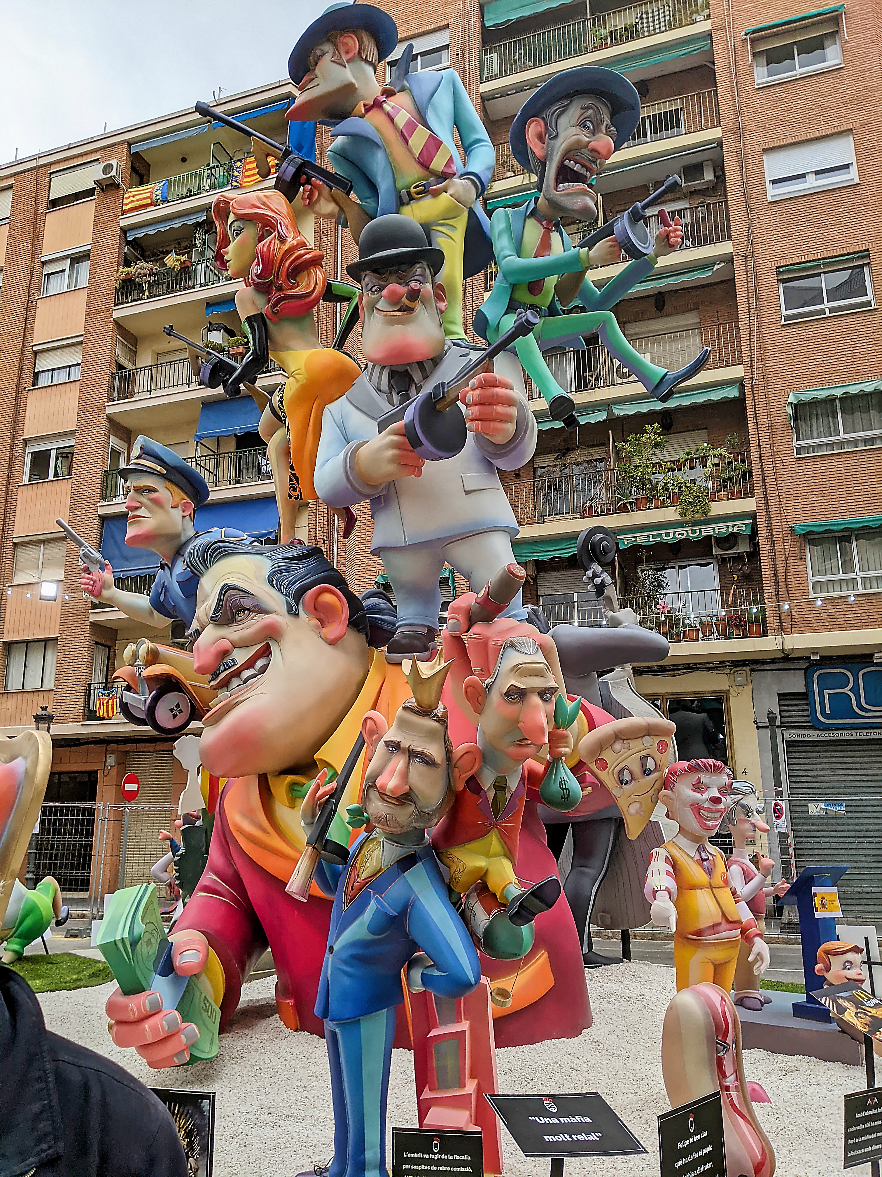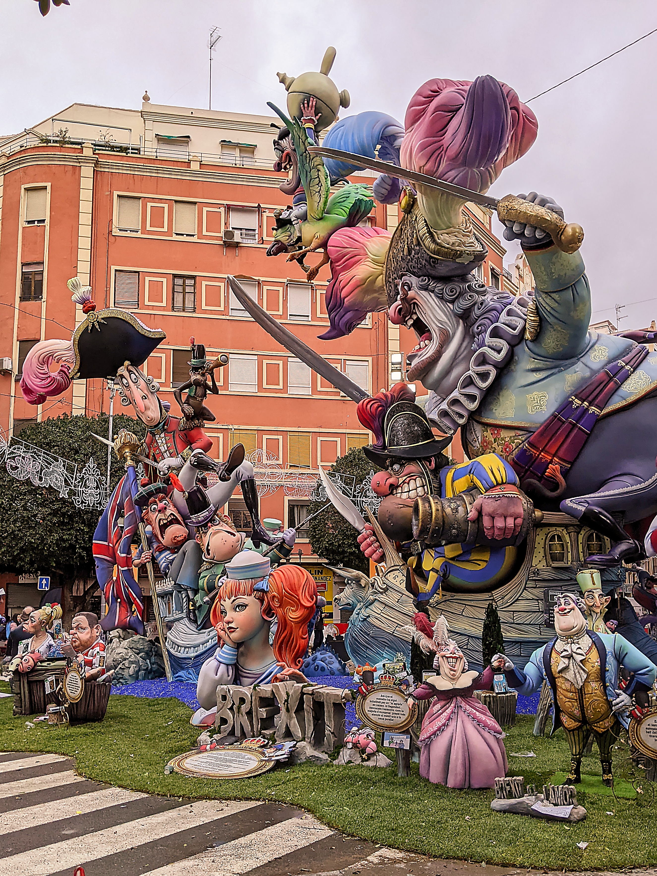 “Our” falla, with a Salvador Dali themeThe detail work on the sculptures can be amazingSponsored by a gaming / gambling company, go figureThis was the biggest falla in the city this year, standing some 5 stories tall and chuck-a-block with imagery.Every day at 2:00 in the Plaza D’Ayuntamiento there’s a “mascleta” or sound show using fireworks. There are also nighttime fireworks. All events are incredibly well attended.The fallas all have a message, usually overtly political. The placards add some context to the sculptures, sadly they were all written in Valenciano which I cannot read so some of the messages were obscured.It’s a safe guess that the puppets are local or national political figures. The puppeteers? I’m guessing Europe but I don’t really know.You can get lost in the details.This fella should be recognizableThe sculptures are made with wood framing and styrofoam to create the shapes and then painted with acrylic. When they burn, it creates a black cloud of nastiness. This year a few sculptures were made from paper, clearly an experiment in a greener Fallas for the future.Commentary on Brexit. Much is being said here, not terribly complimentary to the British or the EU.Brits on the left, EU on the rightBoris and a soccer fan make an appearanceAnother environmental theme, this one lamenting the pollution of l’Albufera, the lake and farmland just south of the city from which much of the rice for paella comes.Given that they’re about to light this guy on fire, the level of detail displayed here is remarkableLa Virgen, unfinished. The Church erects and places the white and red flowers in the structure. Each of the fallas groups throughout the city then bring an offering of flowers ahead of St. John’s day.The big night has arrived! Crowds gather in all of the squares with fallas to watch la Créma, when the sculptures are set on fire. In theory it all takes place just before midnight but in practice each of the big fallas requires a fire crew to attend and keep everything safe. Our falla, at the center of town, didn’t burn until about 1 AMThe children’s falla was lit first, this was at about 11:00Fireworks are used to set the fire, after the falla is partly destroyed and the parts piled into the middleAnd up she goesUntil next year!