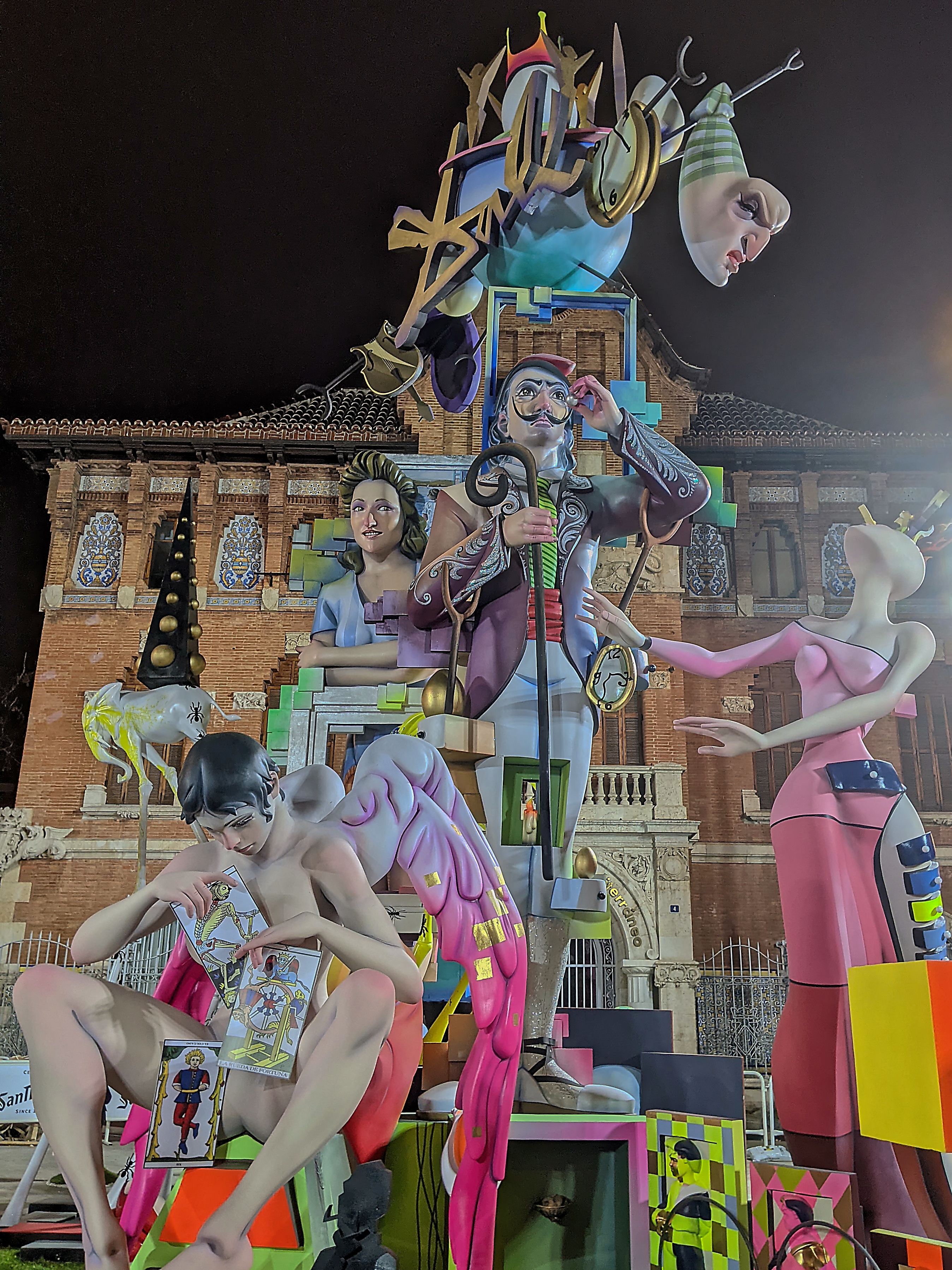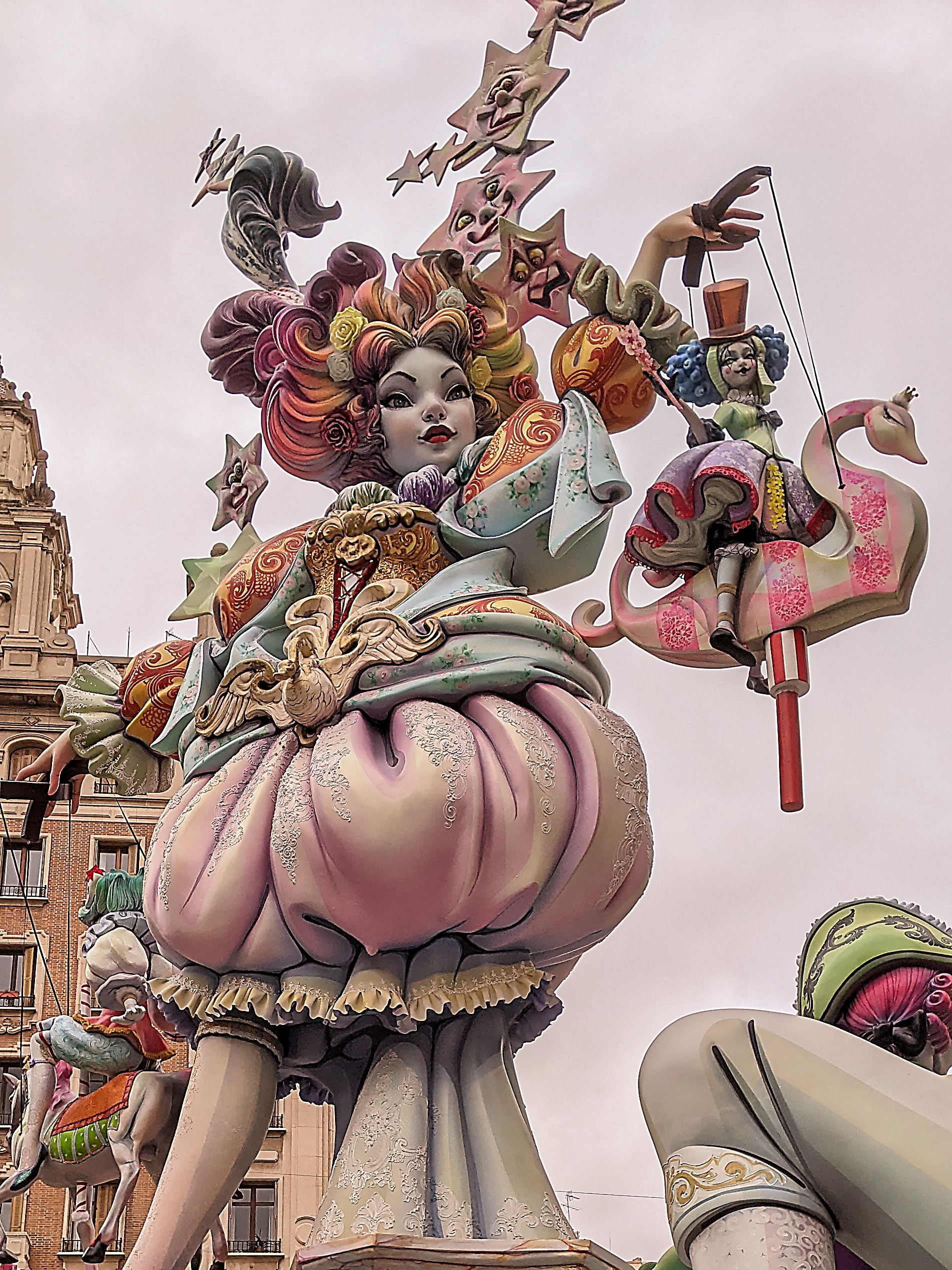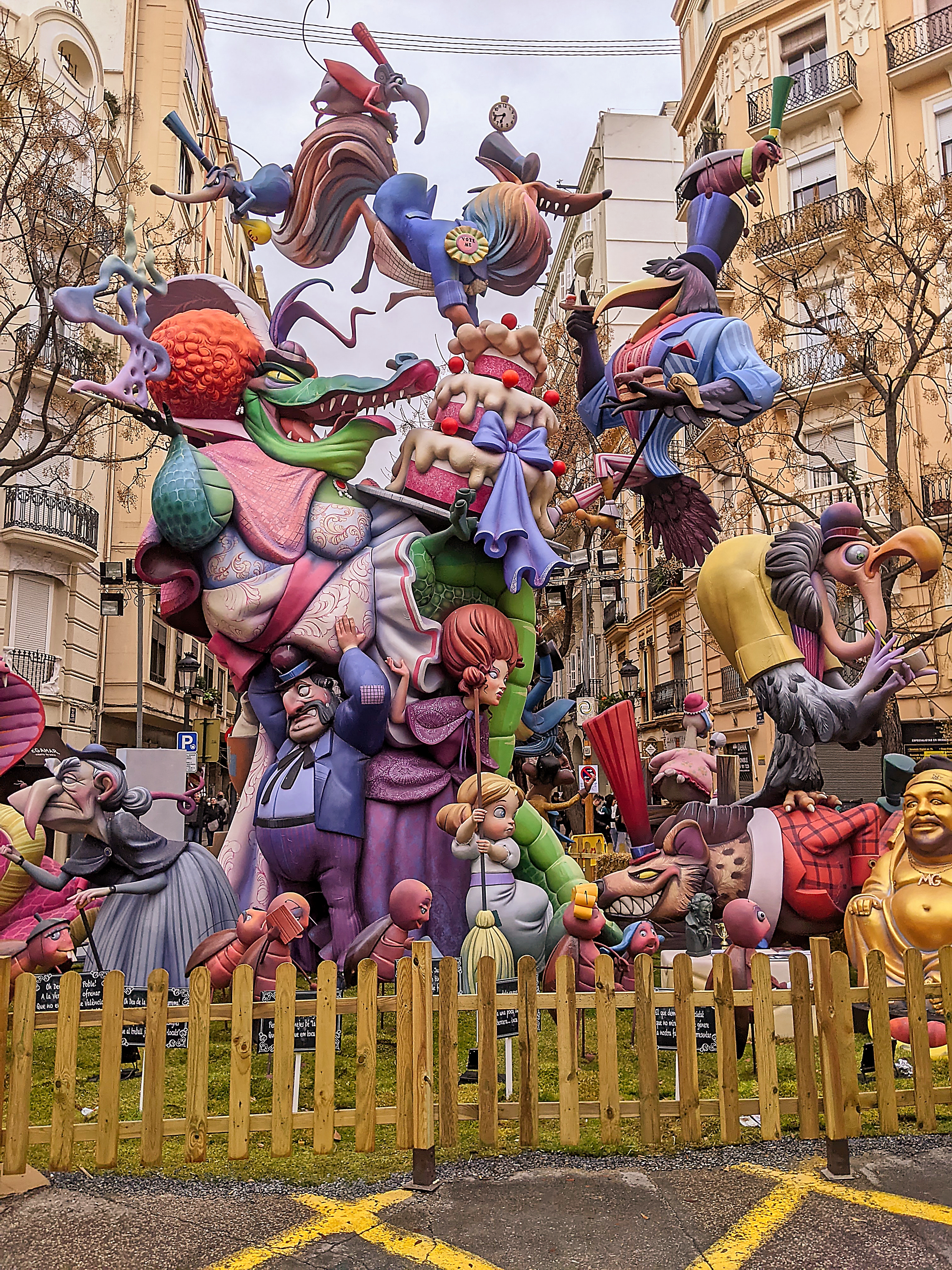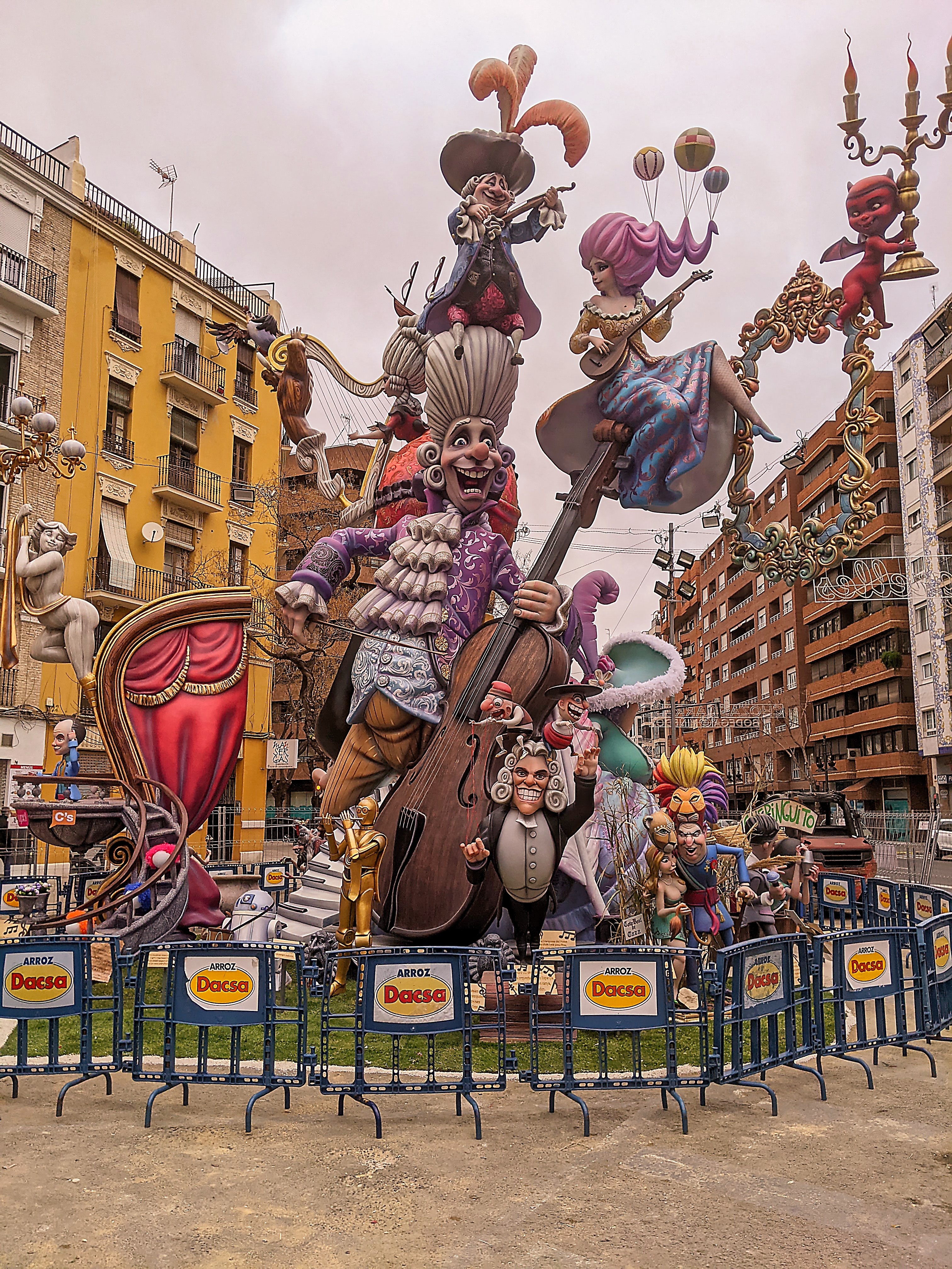 “Our” falla, with a Salvador Dali themeThe detail work on the sculptures can be amazingSponsored by a gaming / gambling company, go figureThis was the biggest falla in the city this year, standing some 5 stories tall and chuck-a-block with imagery.Every day at 2:00 in the Plaza D’Ayuntamiento there’s a “mascleta” or sound show using fireworks. There are also nighttime fireworks. All events are incredibly well attended.The fallas all have a message, usually overtly political. The placards add some context to the sculptures, sadly they were all written in Valenciano which I cannot read so some of the messages were obscured.It’s a safe guess that the puppets are local or national political figures. The puppeteers? I’m guessing Europe but I don’t really know.You can get lost in the details.This fella should be recognizableThe sculptures are made with wood framing and styrofoam to create the shapes and then painted with acrylic. When they burn, it creates a black cloud of nastiness. This year a few sculptures were made from paper, clearly an experiment in a greener Fallas for the future.Commentary on Brexit. Much is being said here, not terribly complimentary to the British or the EU.Brits on the left, EU on the rightBoris and a soccer fan make an appearanceAnother environmental theme, this one lamenting the pollution of l’Albufera, the lake and farmland just south of the city from which much of the rice for paella comes.Given that they’re about to light this guy on fire, the level of detail displayed here is remarkableLa Virgen, unfinished. The Church erects and places the white and red flowers in the structure. Each of the fallas groups throughout the city then bring an offering of flowers ahead of St. John’s day.The big night has arrived! Crowds gather in all of the squares with fallas to watch la Créma, when the sculptures are set on fire. In theory it all takes place just before midnight but in practice each of the big fallas requires a fire crew to attend and keep everything safe. Our falla, at the center of town, didn’t burn until about 1 AMThe children’s falla was lit first, this was at about 11:00Fireworks are used to set the fire, after the falla is partly destroyed and the parts piled into the middleAnd up she goesUntil next year!