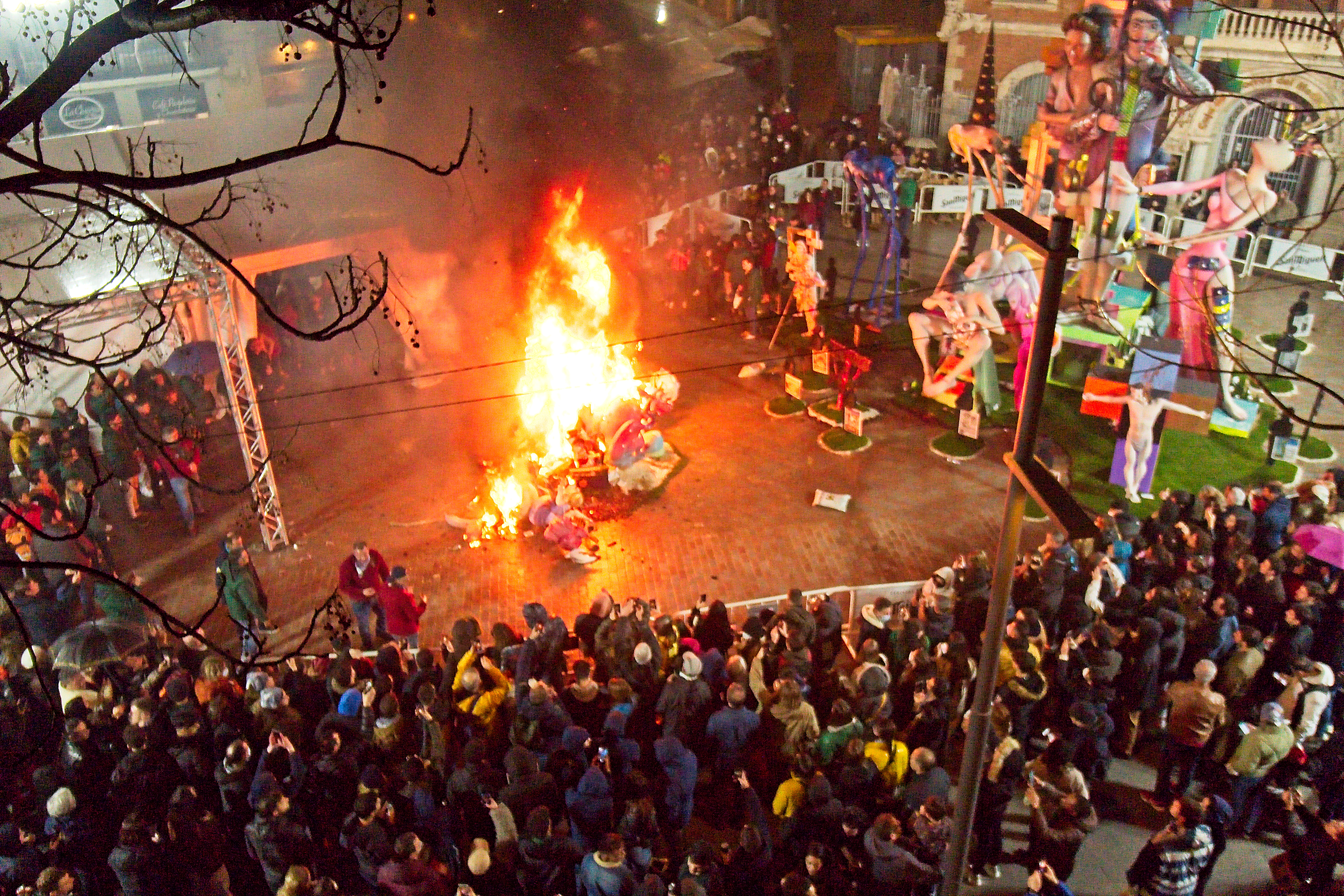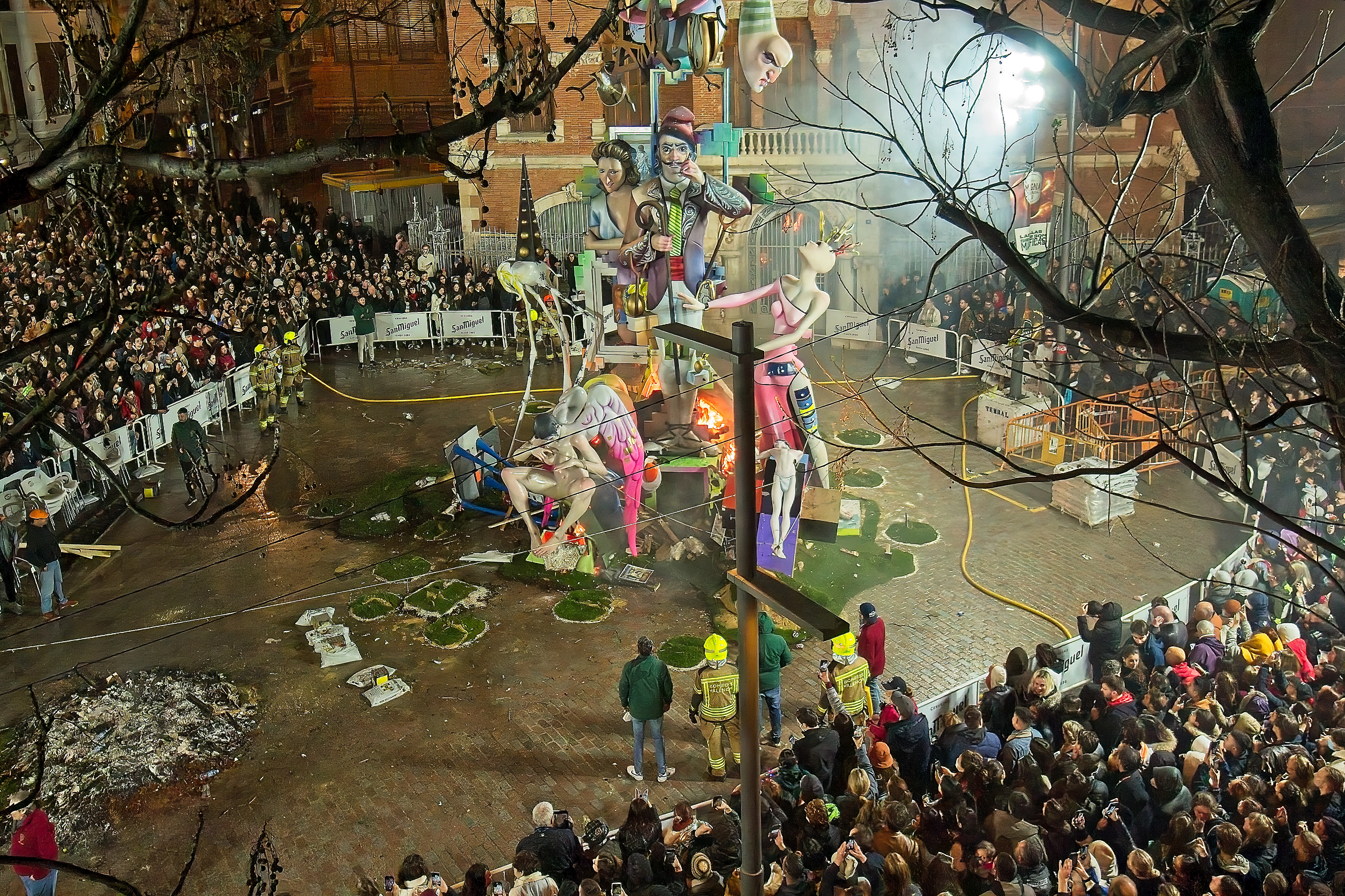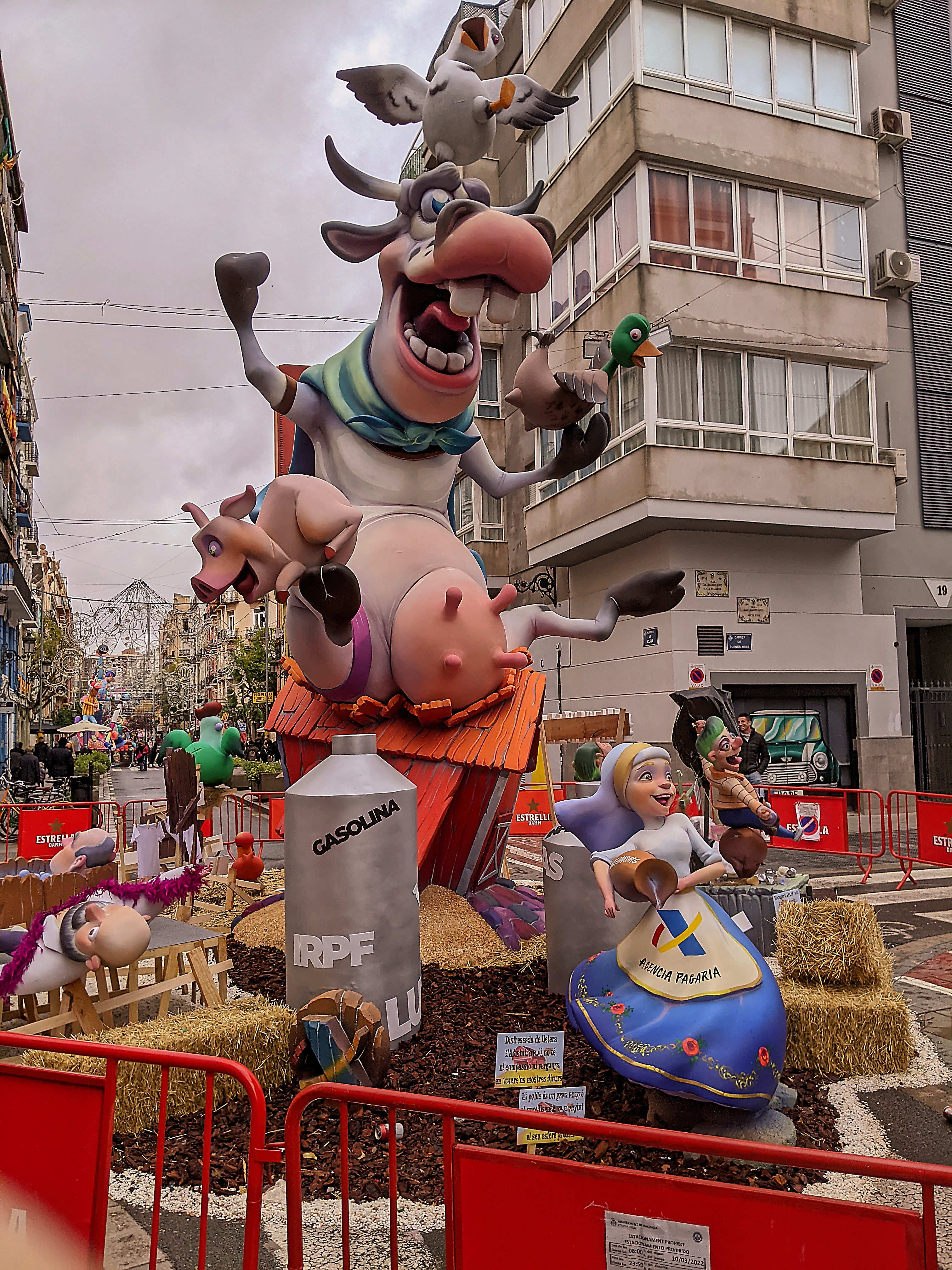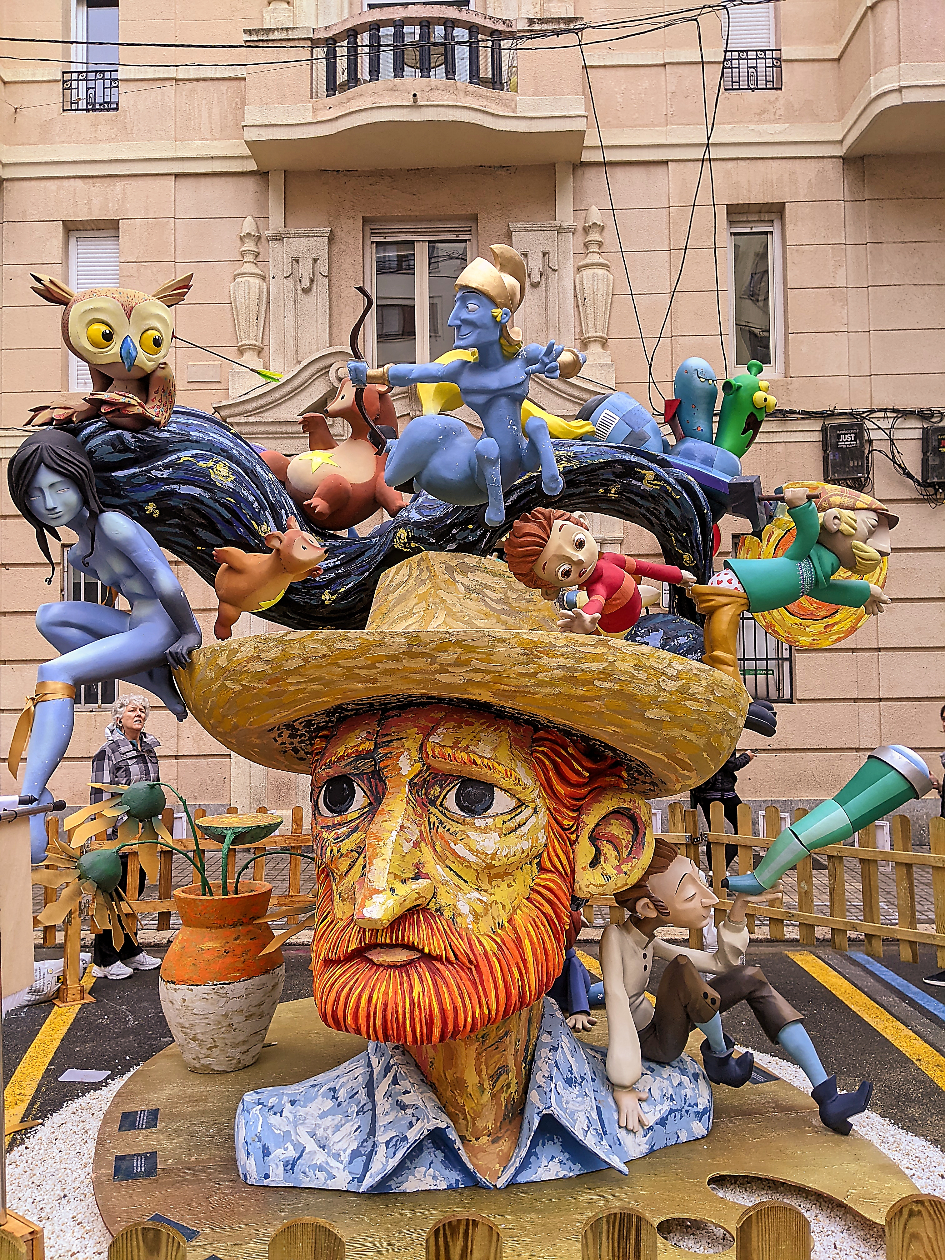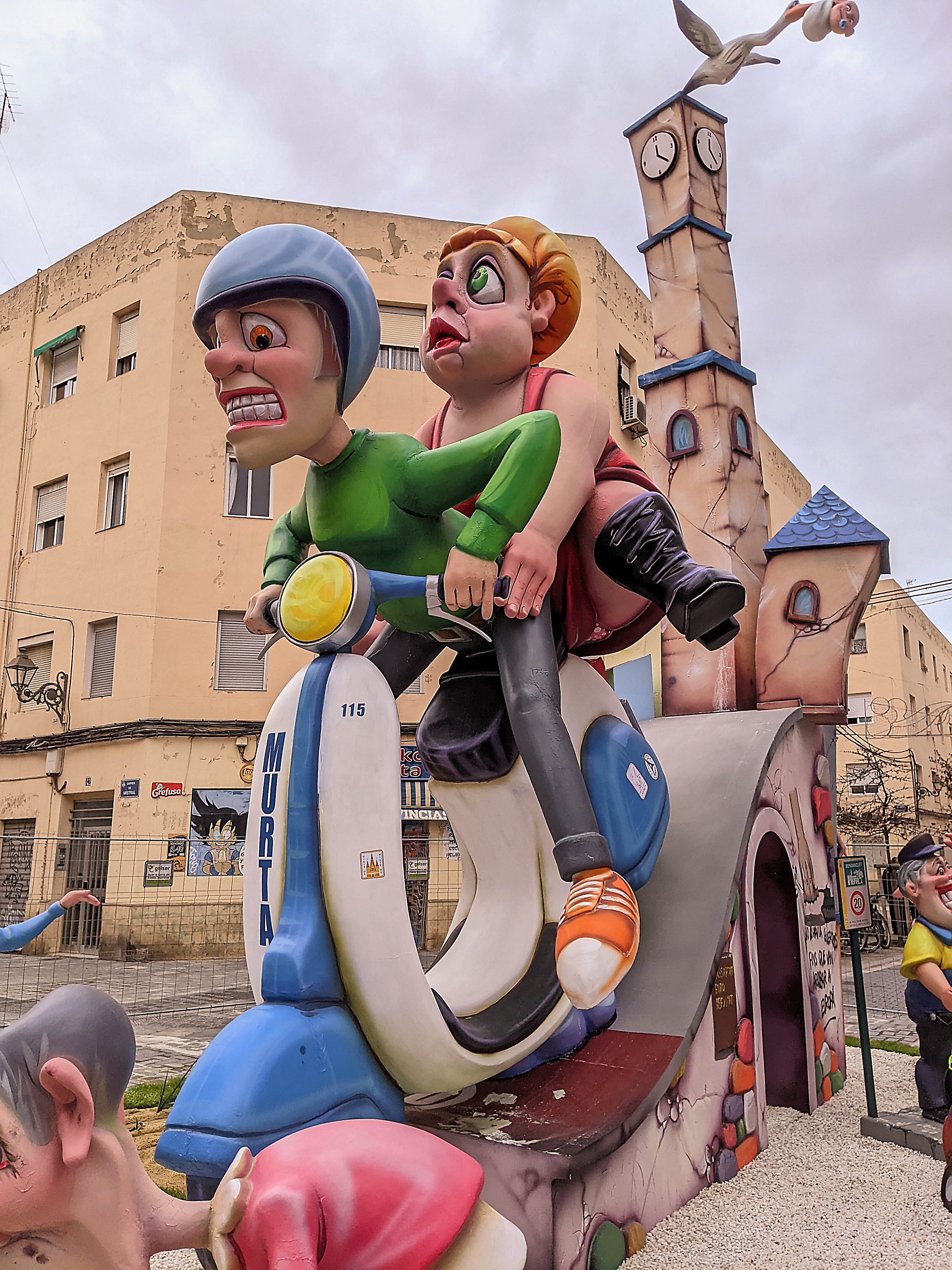 “Our” falla, with a Salvador Dali themeThe detail work on the sculptures can be amazingSponsored by a gaming / gambling company, go figureThis was the biggest falla in the city this year, standing some 5 stories tall and chuck-a-block with imagery.Every day at 2:00 in the Plaza D’Ayuntamiento there’s a “mascleta” or sound show using fireworks. There are also nighttime fireworks. All events are incredibly well attended.The fallas all have a message, usually overtly political. The placards add some context to the sculptures, sadly they were all written in Valenciano which I cannot read so some of the messages were obscured.It’s a safe guess that the puppets are local or national political figures. The puppeteers? I’m guessing Europe but I don’t really know.You can get lost in the details.This fella should be recognizableThe sculptures are made with wood framing and styrofoam to create the shapes and then painted with acrylic. When they burn, it creates a black cloud of nastiness. This year a few sculptures were made from paper, clearly an experiment in a greener Fallas for the future.Commentary on Brexit. Much is being said here, not terribly complimentary to the British or the EU.Brits on the left, EU on the rightBoris and a soccer fan make an appearanceAnother environmental theme, this one lamenting the pollution of l’Albufera, the lake and farmland just south of the city from which much of the rice for paella comes.Given that they’re about to light this guy on fire, the level of detail displayed here is remarkableLa Virgen, unfinished. The Church erects and places the white and red flowers in the structure. Each of the fallas groups throughout the city then bring an offering of flowers ahead of St. John’s day.The big night has arrived! Crowds gather in all of the squares with fallas to watch la Créma, when the sculptures are set on fire. In theory it all takes place just before midnight but in practice each of the big fallas requires a fire crew to attend and keep everything safe. Our falla, at the center of town, didn’t burn until about 1 AMThe children’s falla was lit first, this was at about 11:00Fireworks are used to set the fire, after the falla is partly destroyed and the parts piled into the middleAnd up she goesUntil next year!