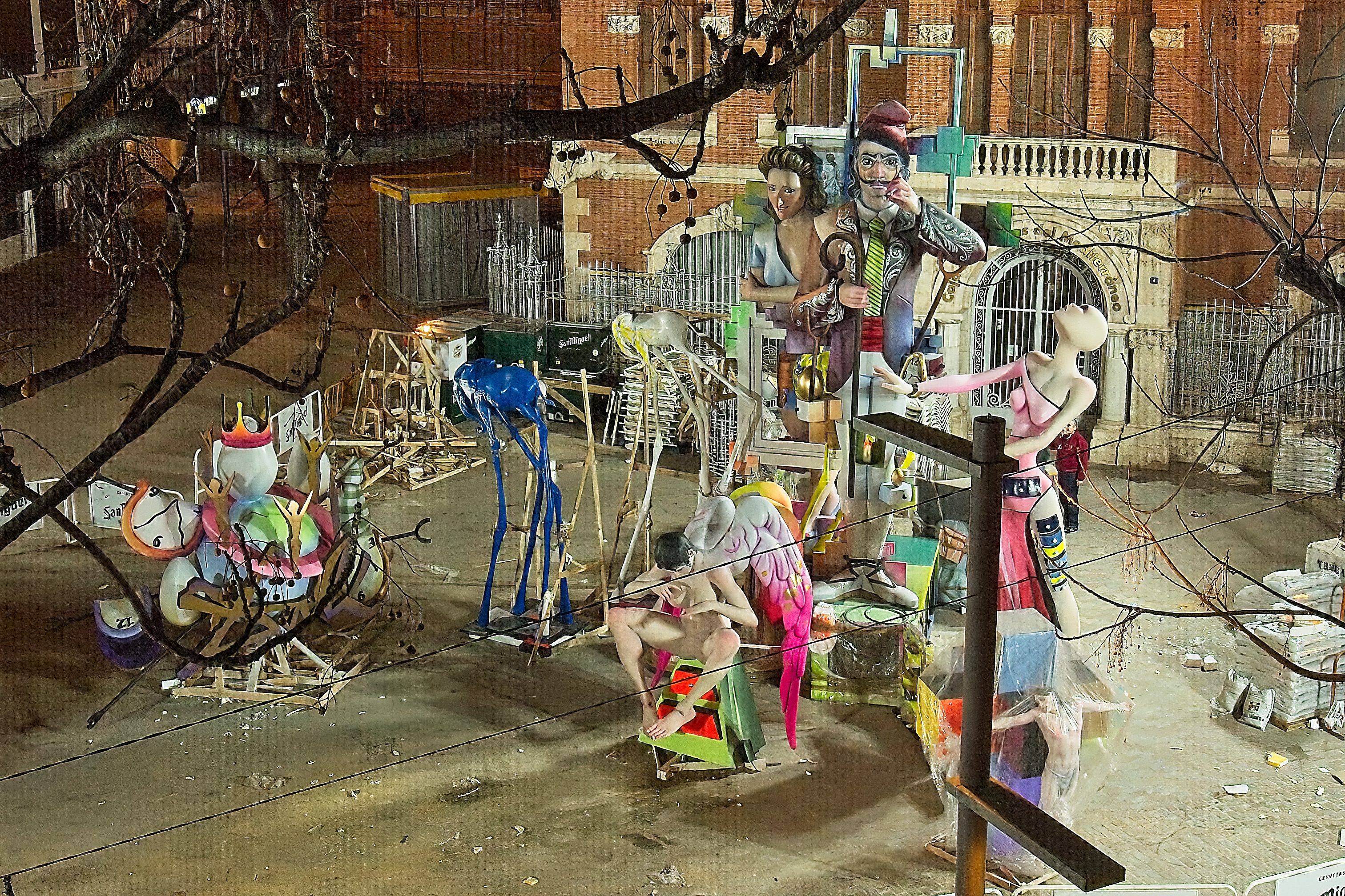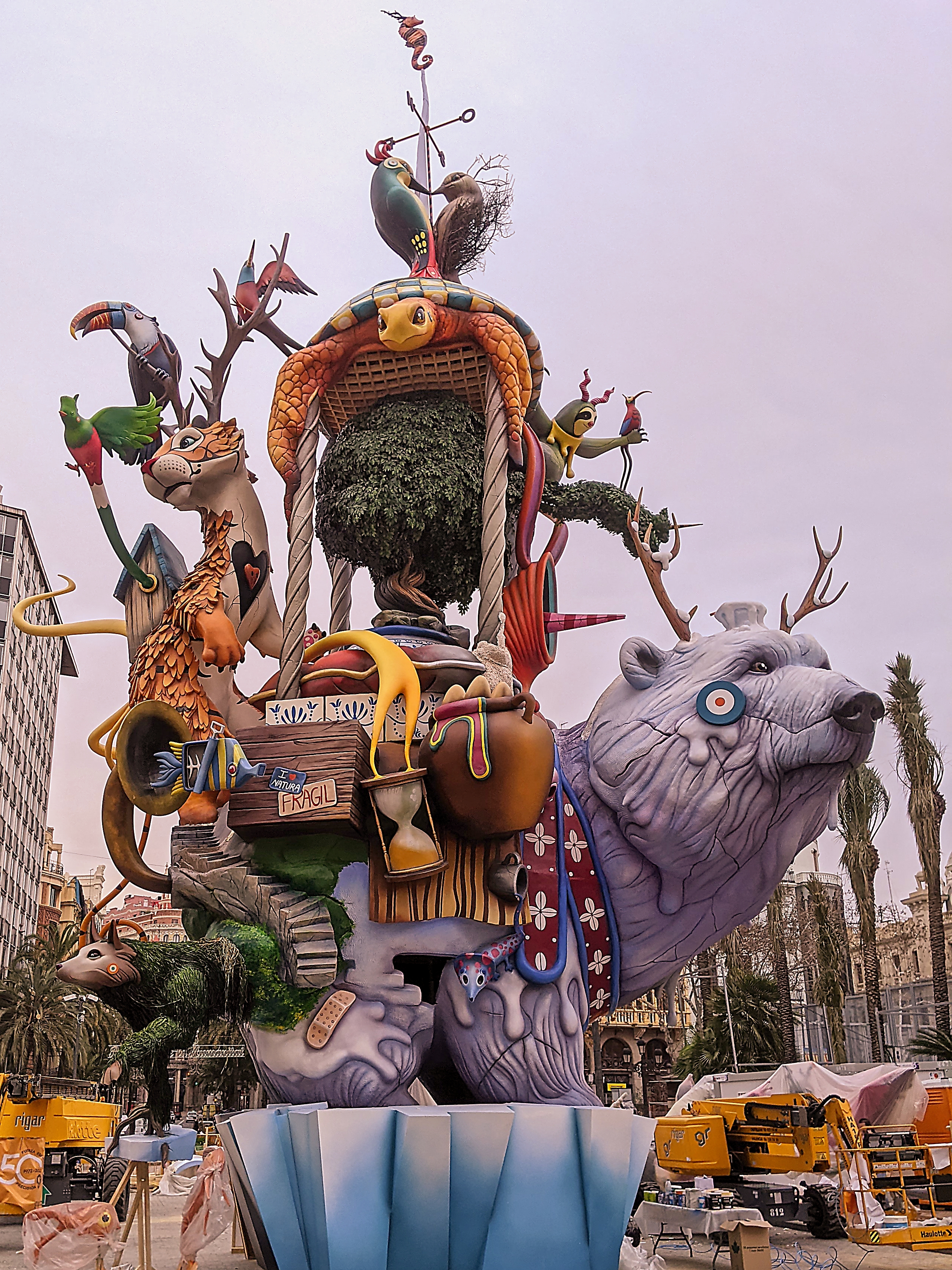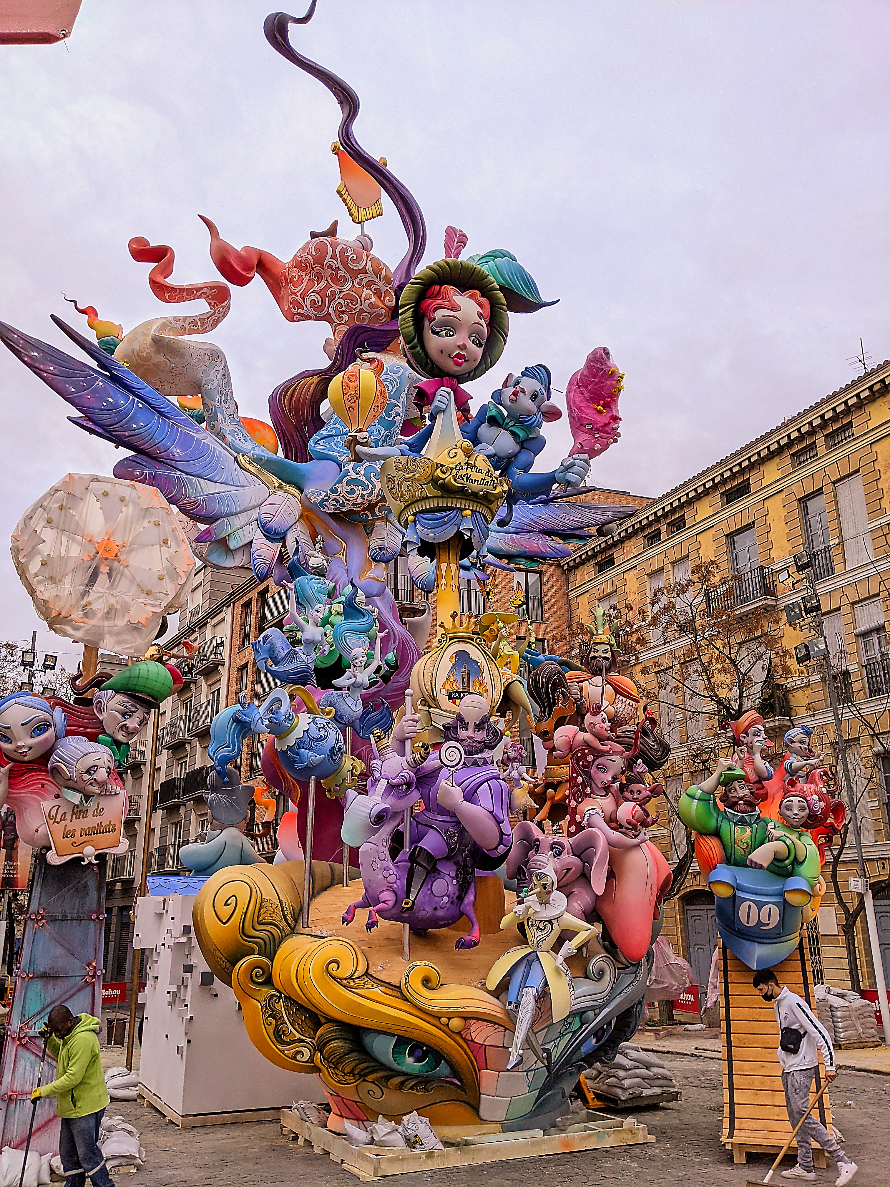 This is right in front of our place and we could see it was going to be big.After a day of work, you could see the structure begin to take shapeOur plaza has been transformed! The crowds and vendors ran nonstop for nearly two weeks. The large crowd in the distance is spillover from Plaza d’Ayuntiamento for a mascleta.In my walks around town for the next week or so, I could watch the structures go up.This is the biggest one, in front of City Hall. It has an environmentla themeYou can get some sense of the scale of these things with our friends sweeping up in the foreground. This isn’t even one of the bigger ones.
