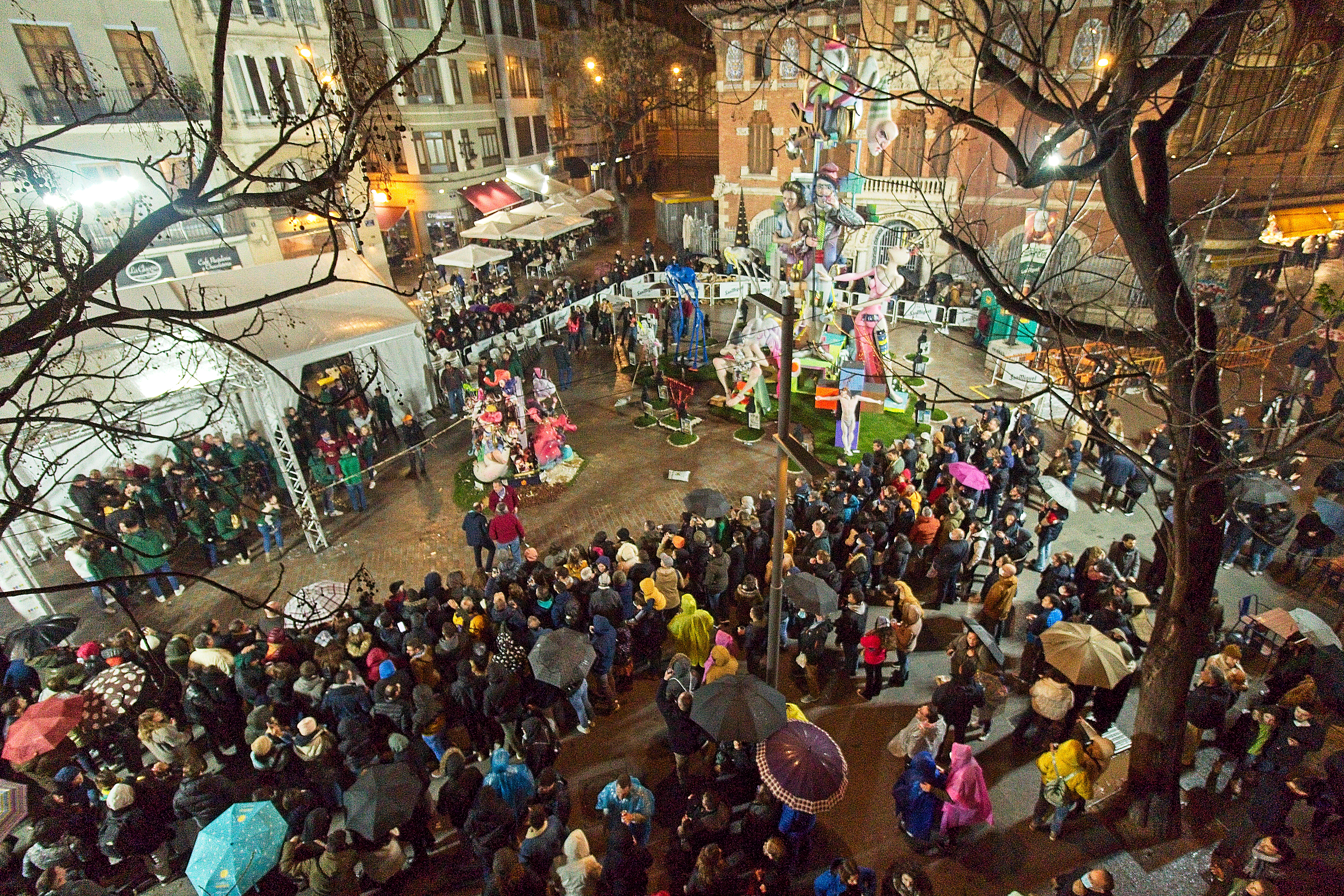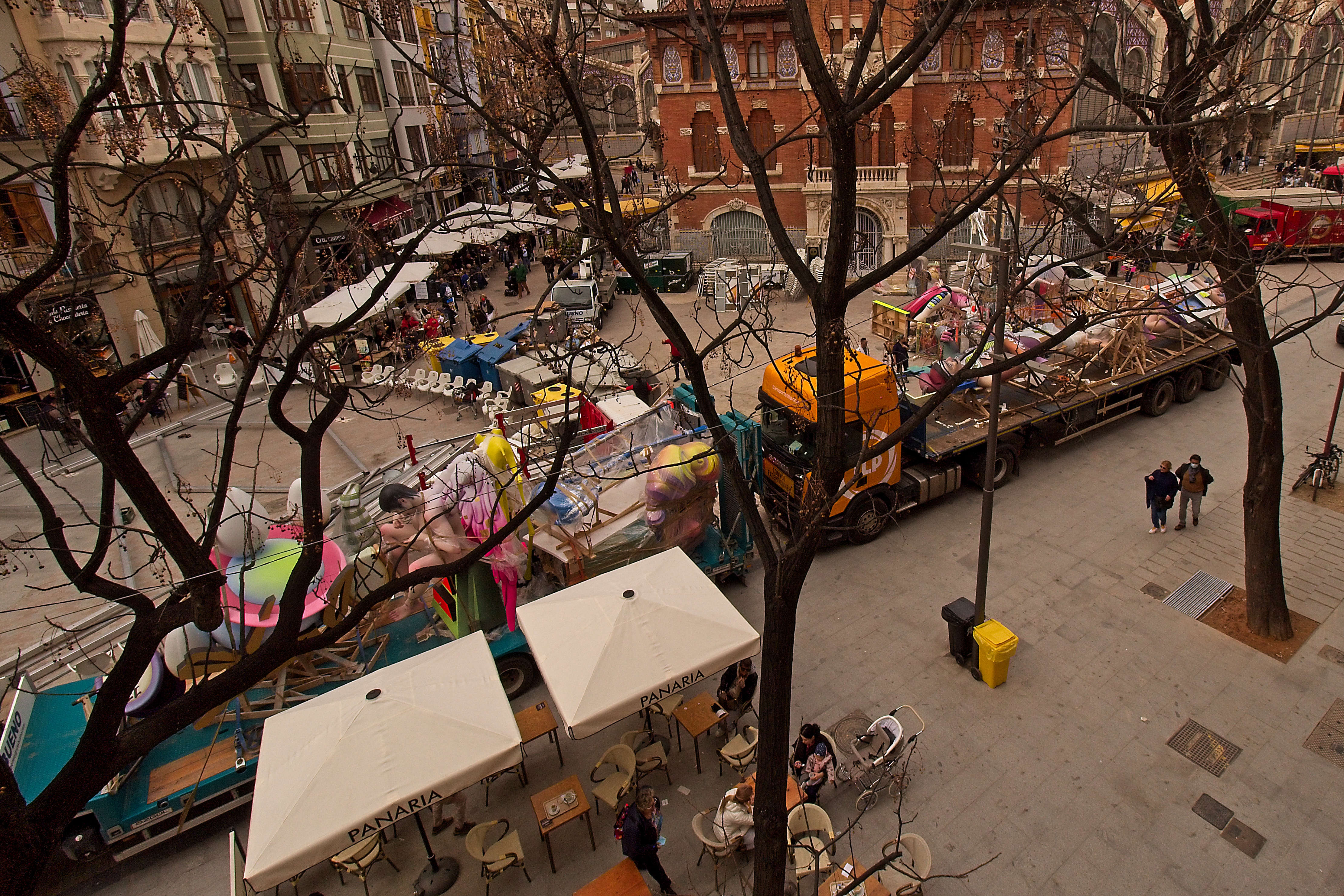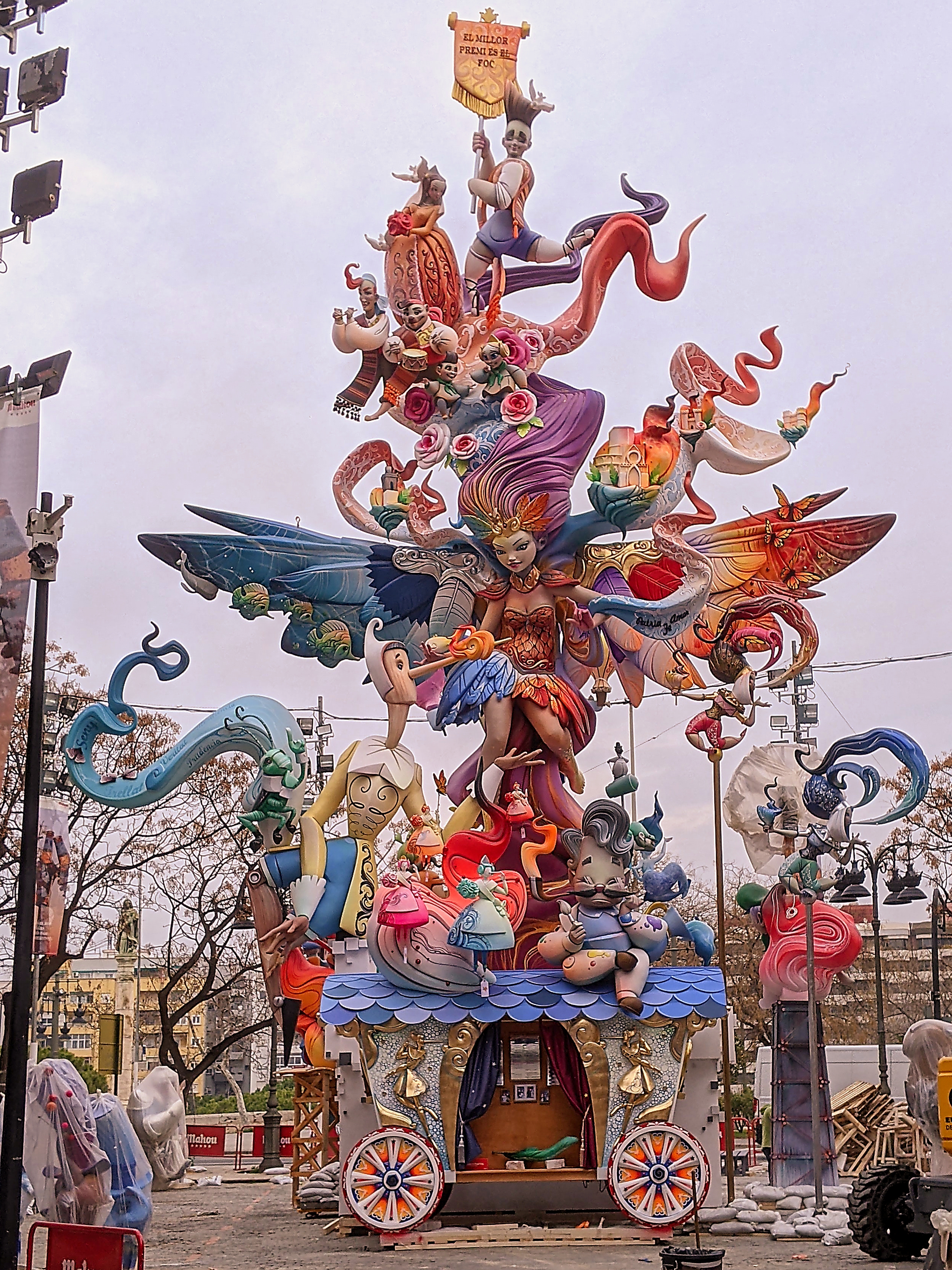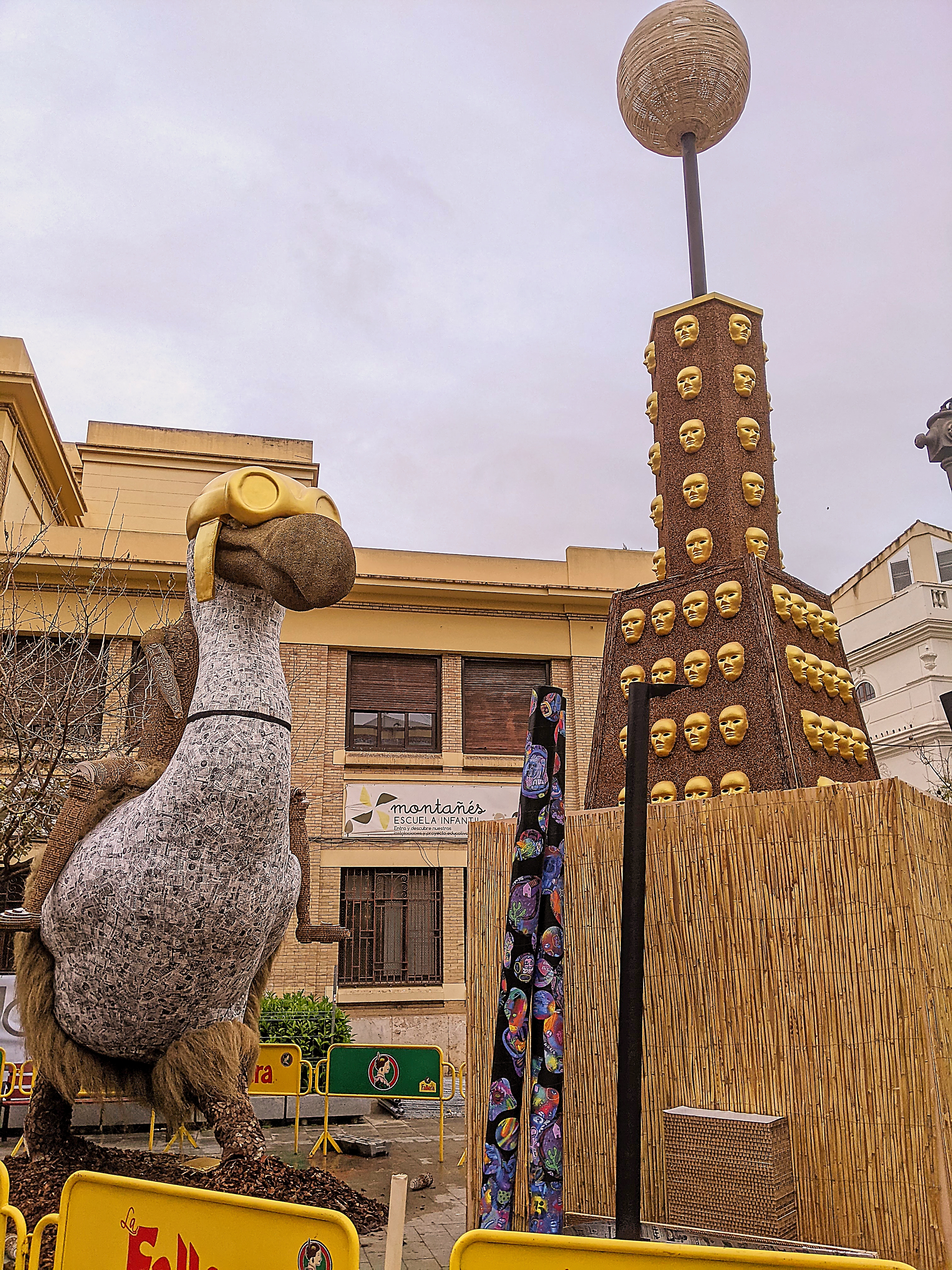 This is right in front of our place and we could see it was going to be big.After a day of work, you could see the structure begin to take shapeOur plaza has been transformed! The crowds and vendors ran nonstop for nearly two weeks. The large crowd in the distance is spillover from Plaza d’Ayuntiamento for a mascleta.In my walks around town for the next week or so, I could watch the structures go up.This is the biggest one, in front of City Hall. It has an environmentla themeYou can get some sense of the scale of these things with our friends sweeping up in the foreground. This isn’t even one of the bigger ones.
