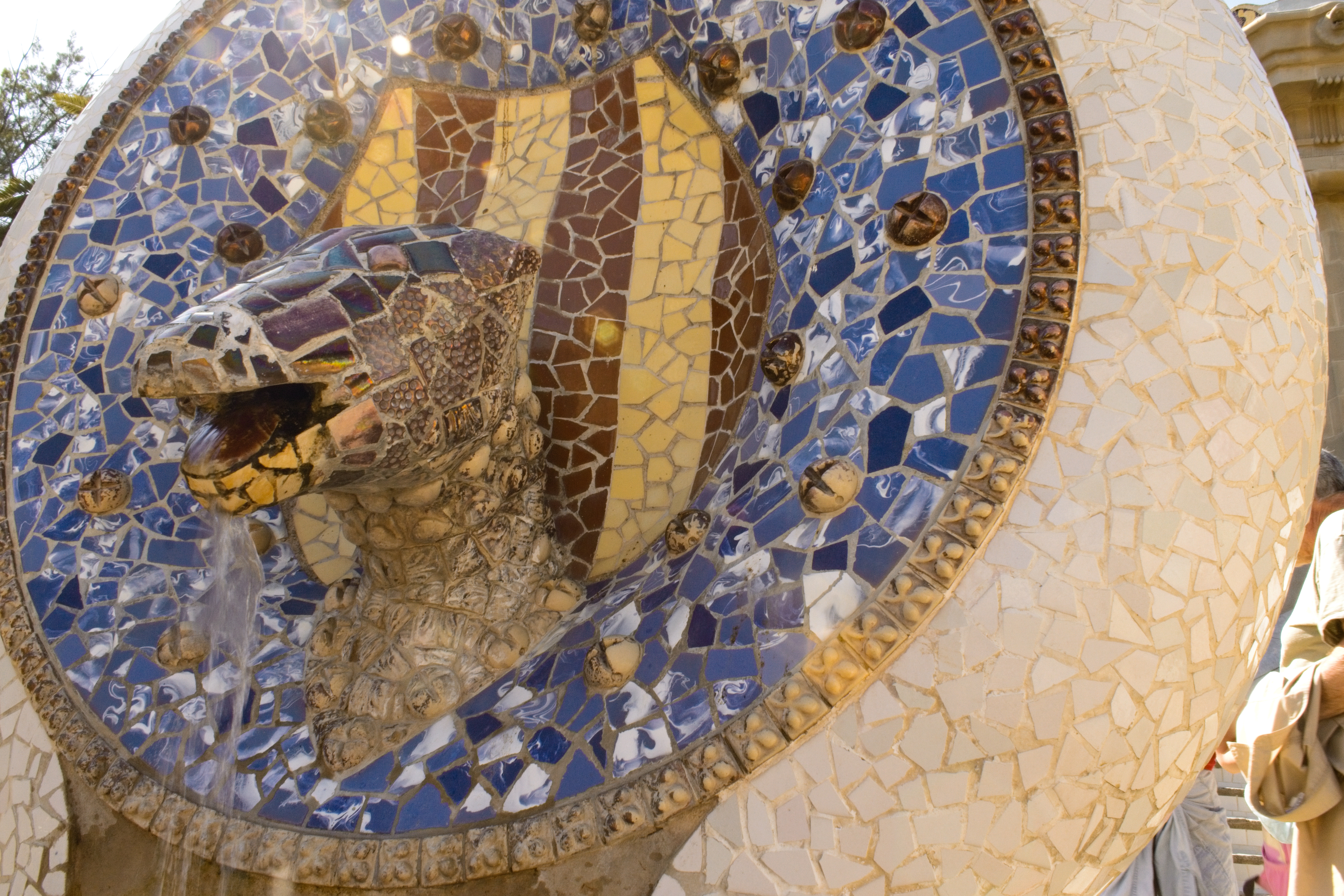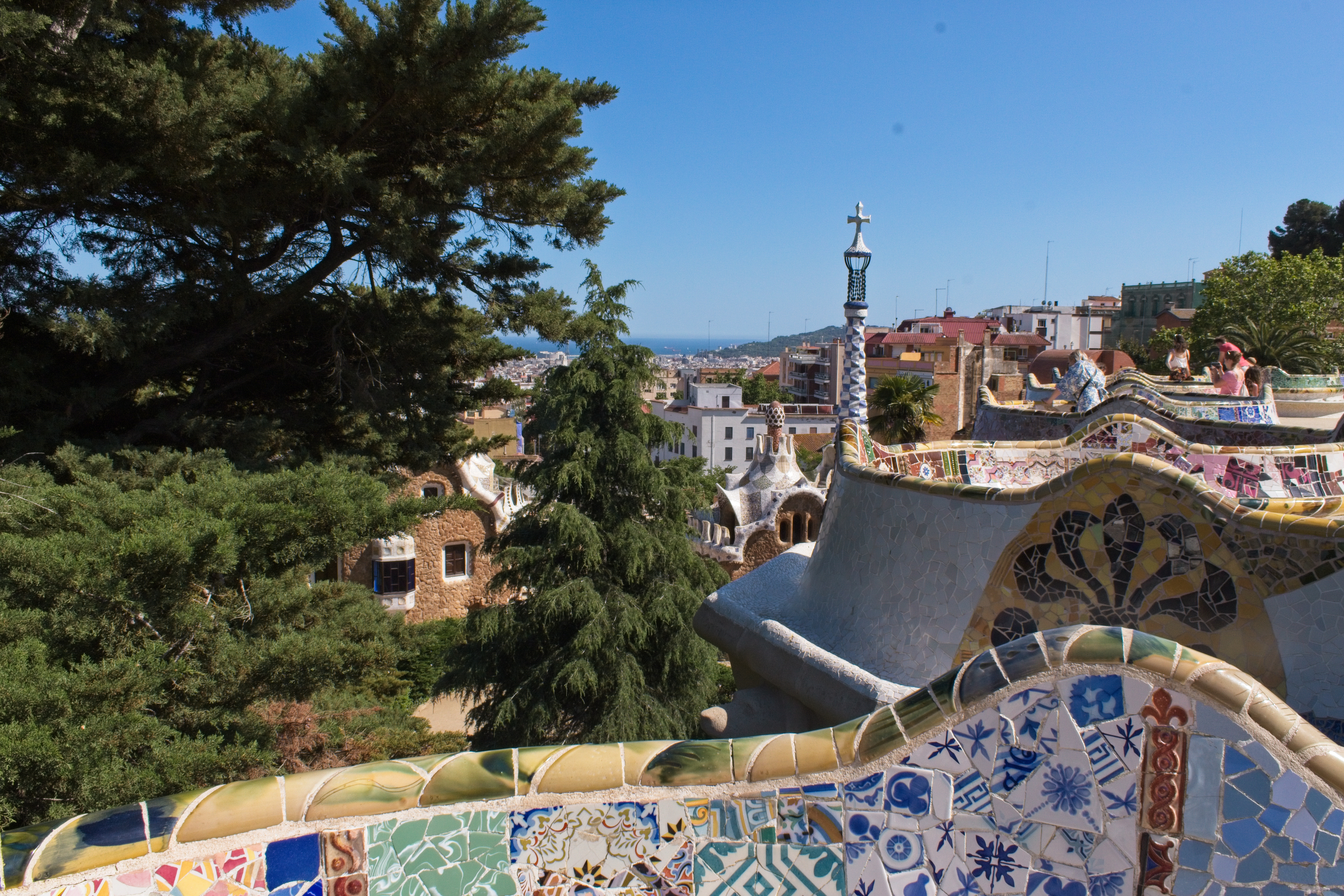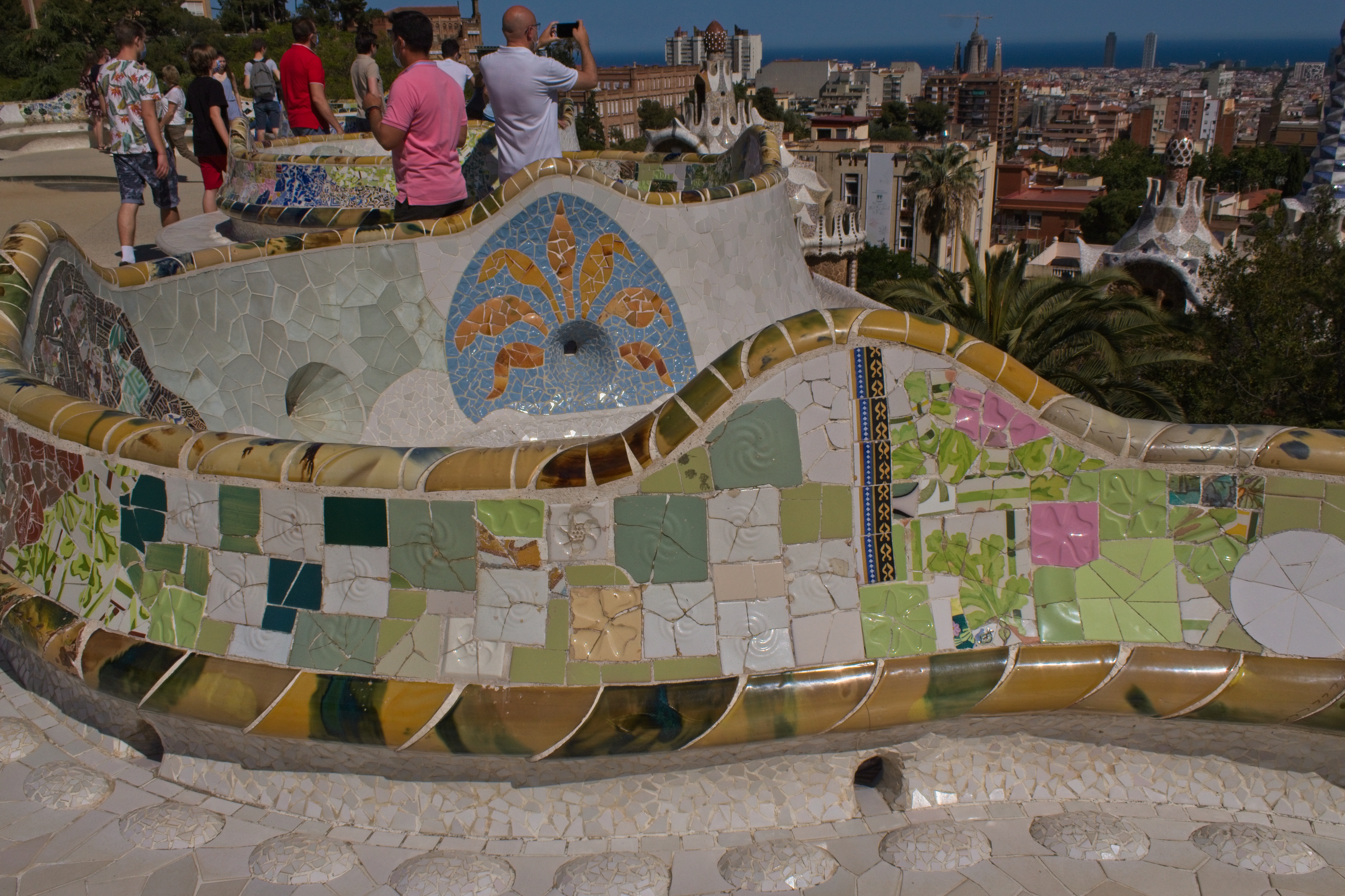 The “Serpentine Bench.” It was built in this shape on purpose to give groups privacy in crowds; the bumps in the foreground are on the bench seat to keep people’s behinds out of the gutters. The broken tilework is a Gaudí signature; it allowed him to decorate his sinuous shapes with tiles and the effect is remarkable.