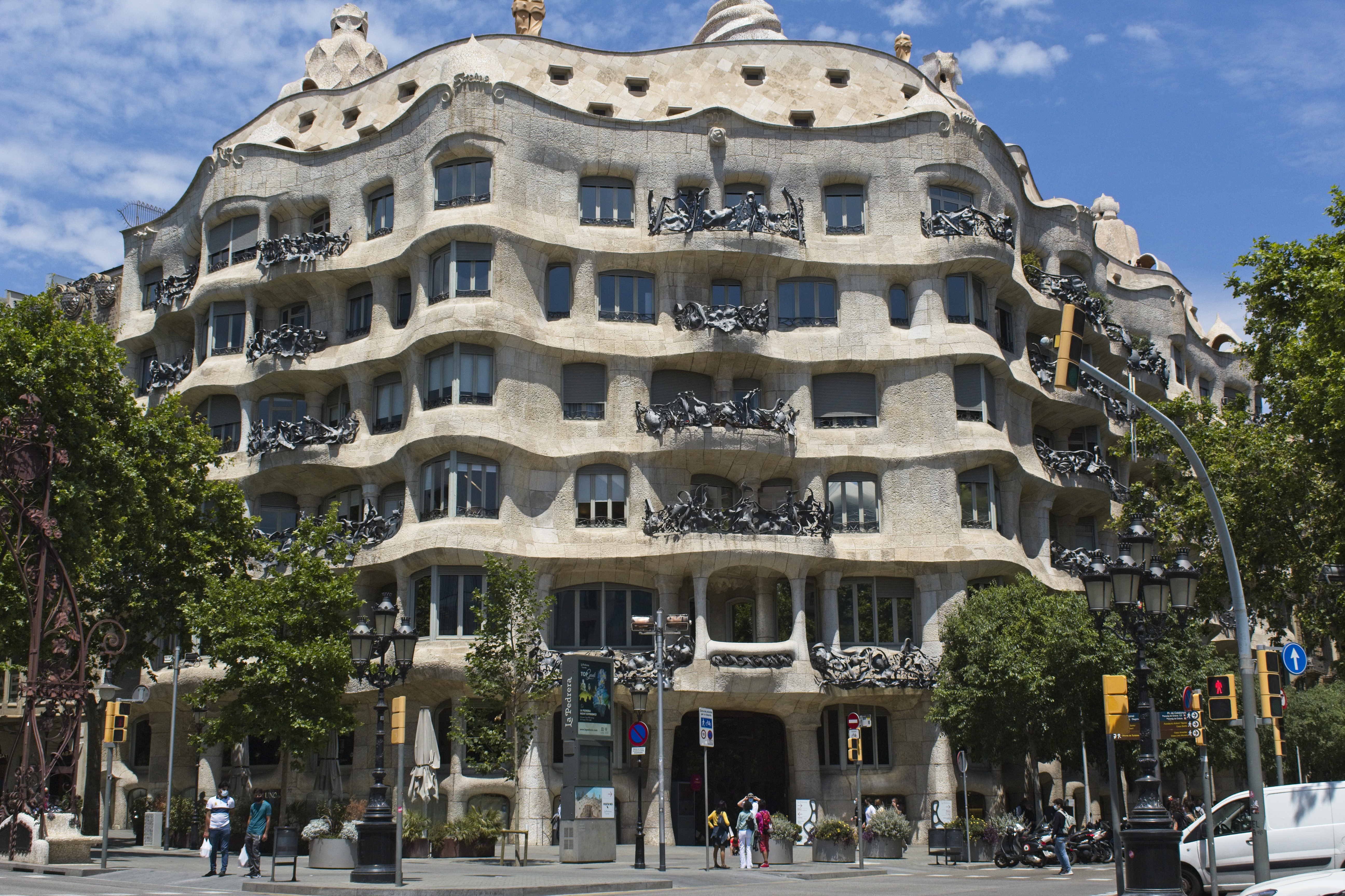 The third building we visited on our Gaudí tour. This one he got to do a complete tear-down and rebuild and he made heavy use of his catenary arches inside, and built the interior spaces with big light wells and sensible layouts so every room had lots of light and the houses made sense. Details on the balconies were amazing, made from wrought iron.