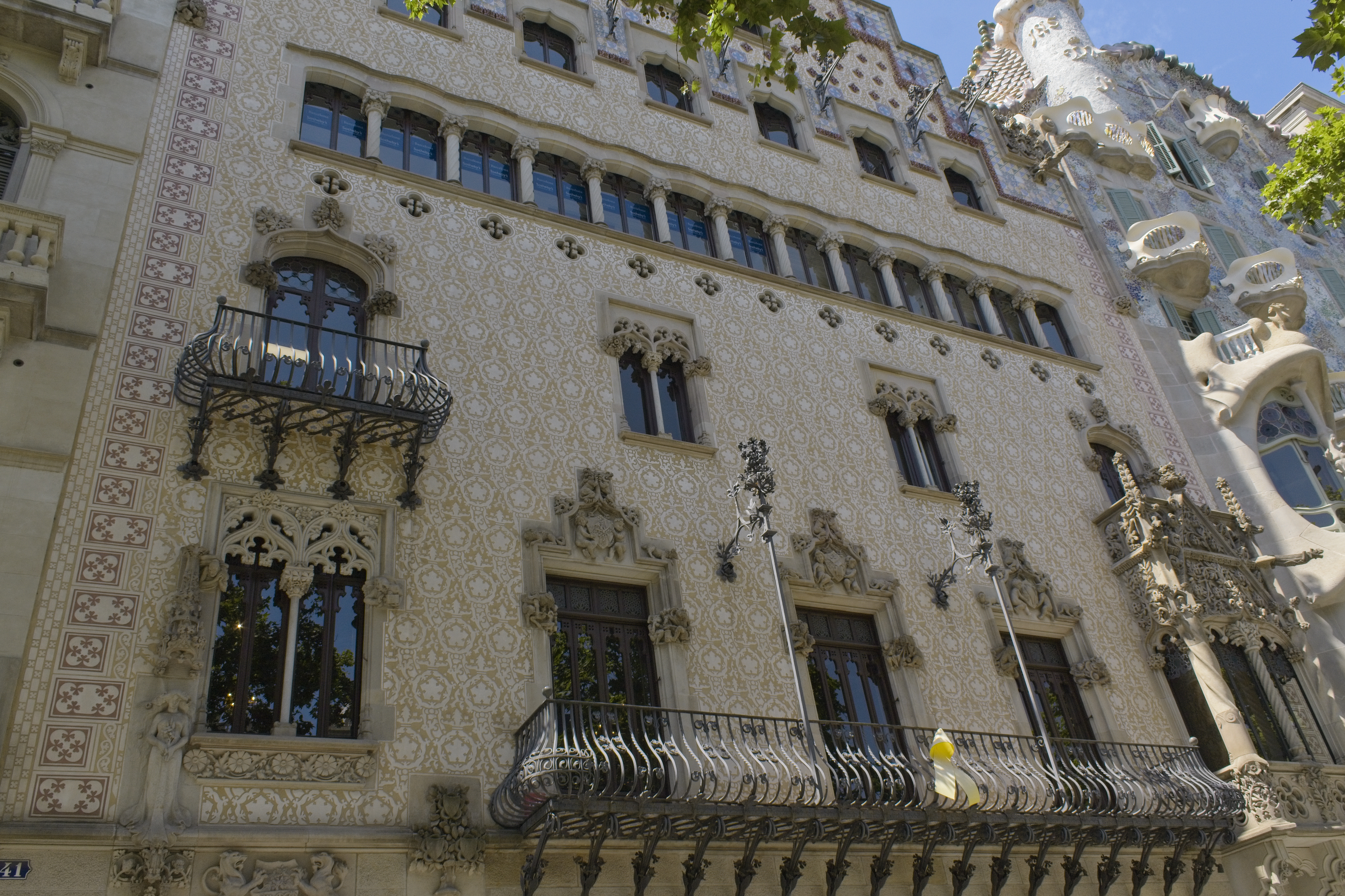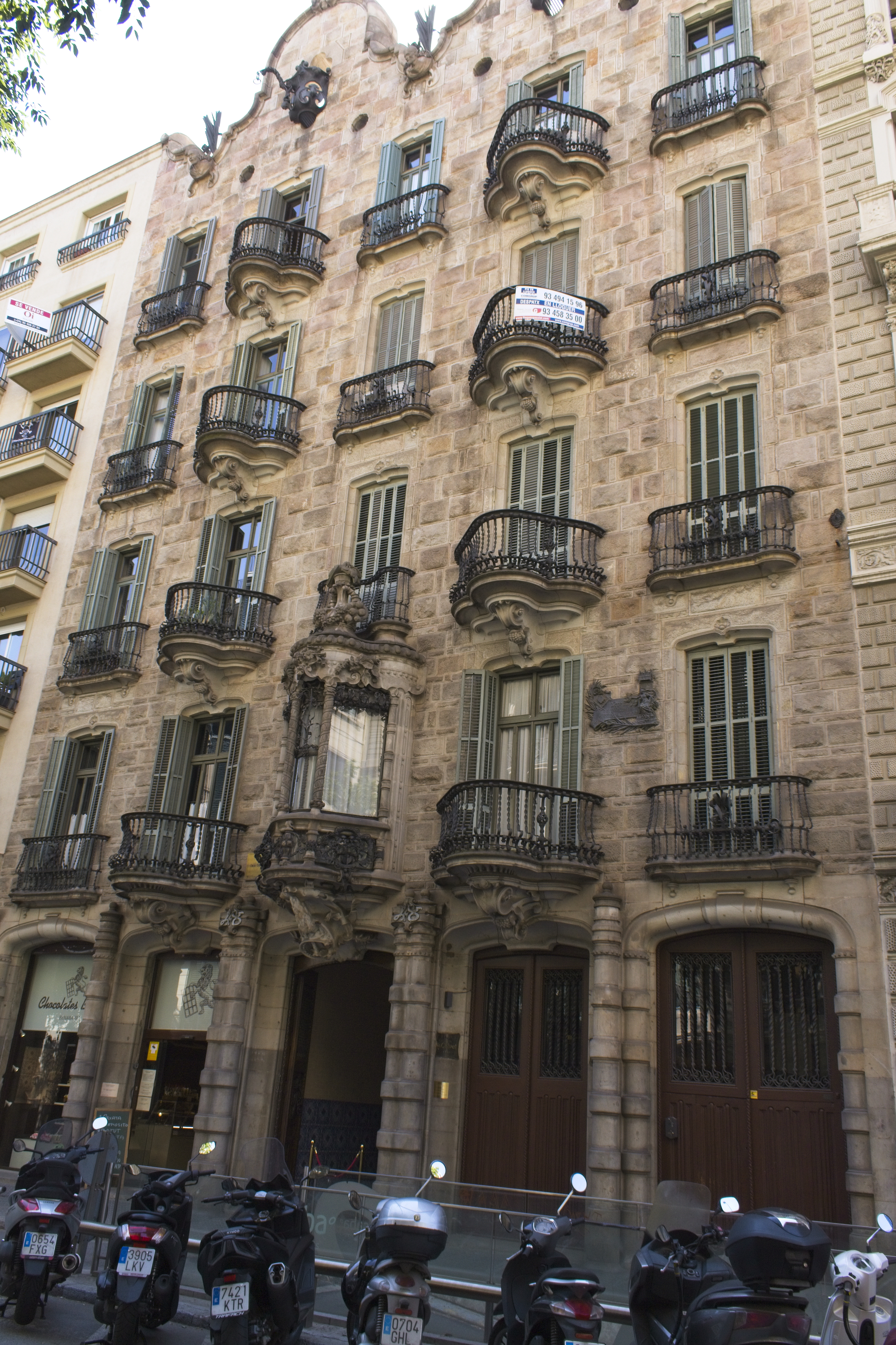 The first house Gaudí remodeled. He was constrained by regulations that forced him to keep the facade so all he could do was play with balconies, columns and decoration. The house itself was configured as a commercial business on the ground floor, storage in the basement and family quarters on the first floor. Floors above were rented out. His use of organic shapes for the balconies and the top of the building and his use of natural and human figures in the decorations hint at what was to come.