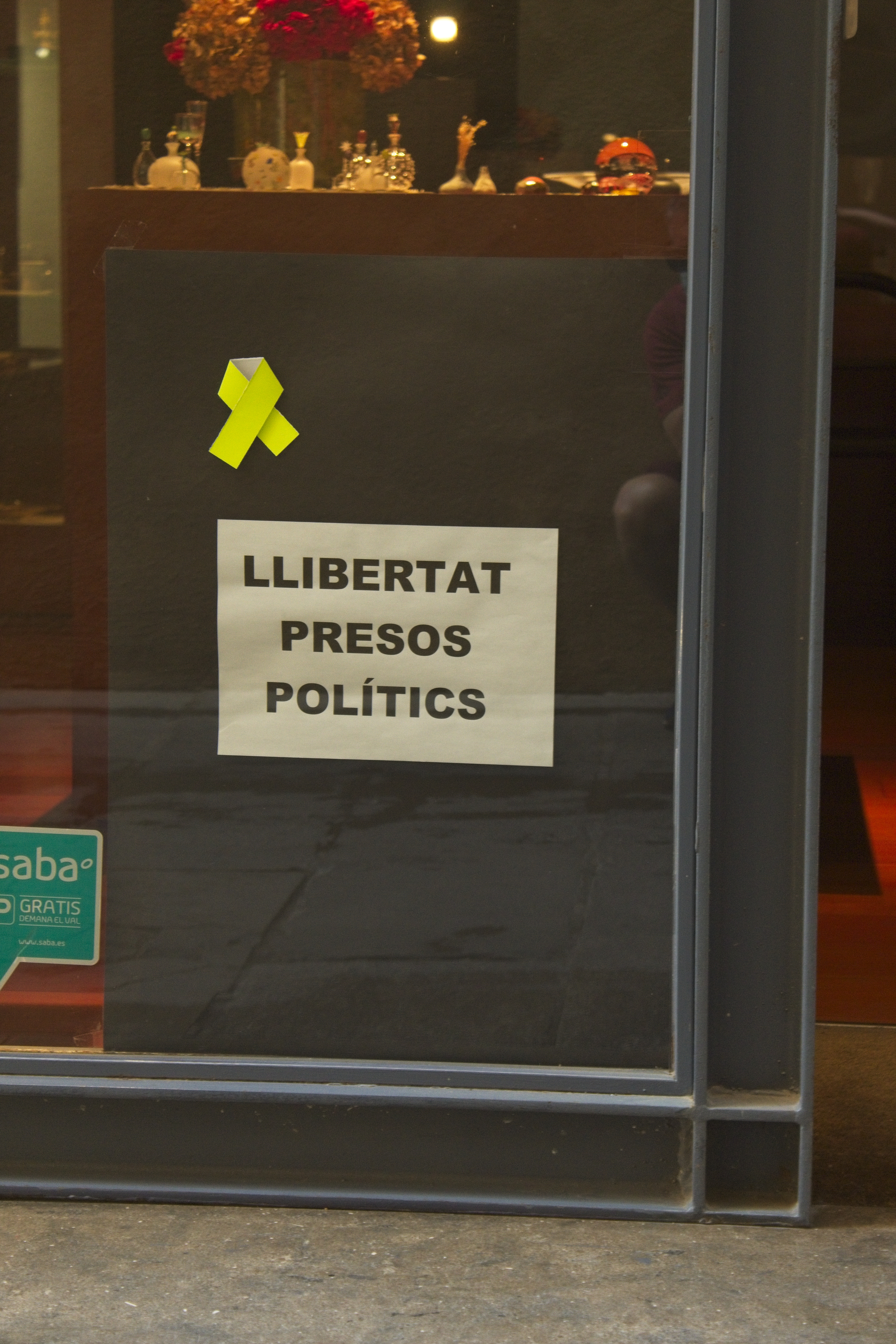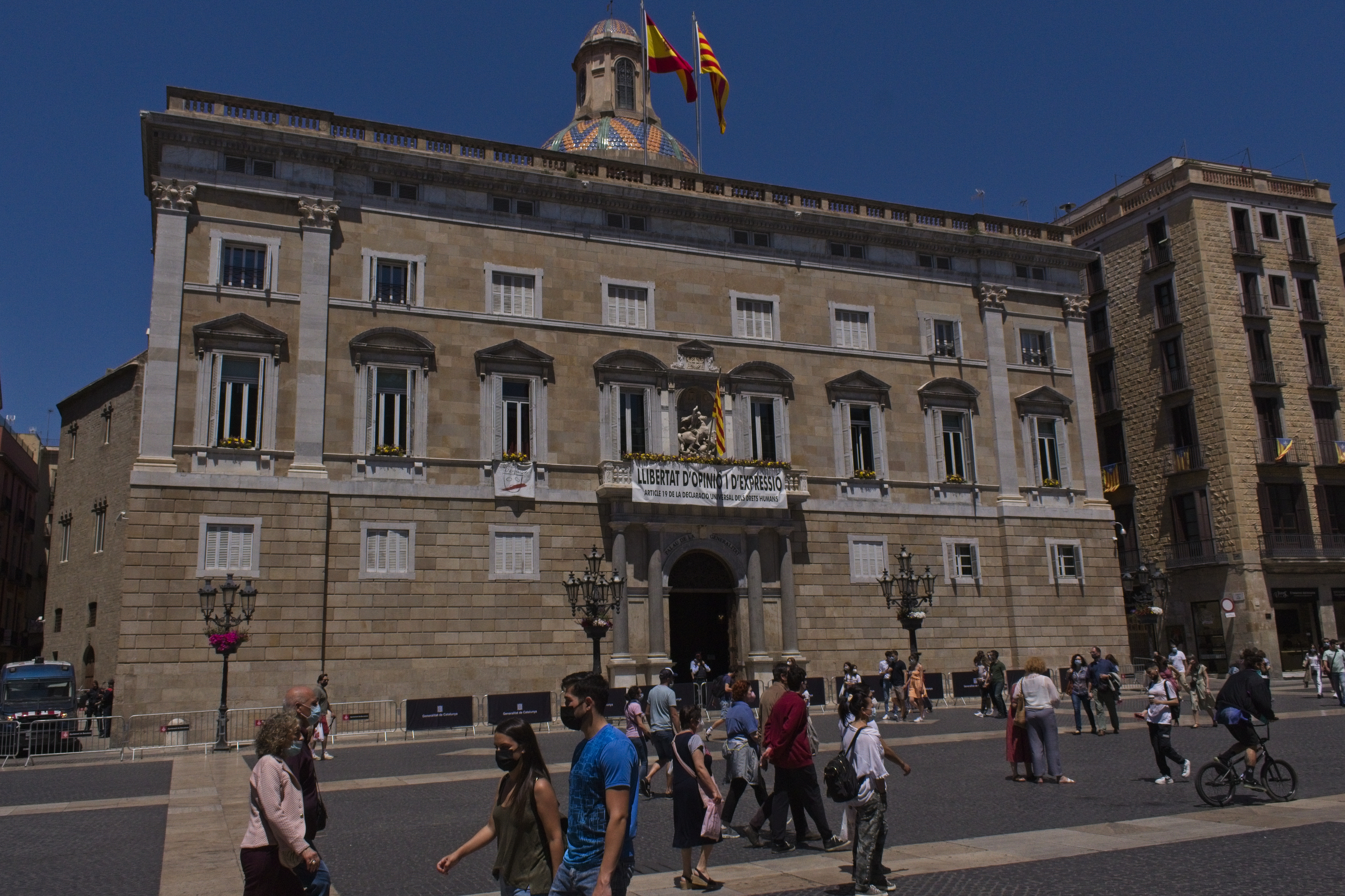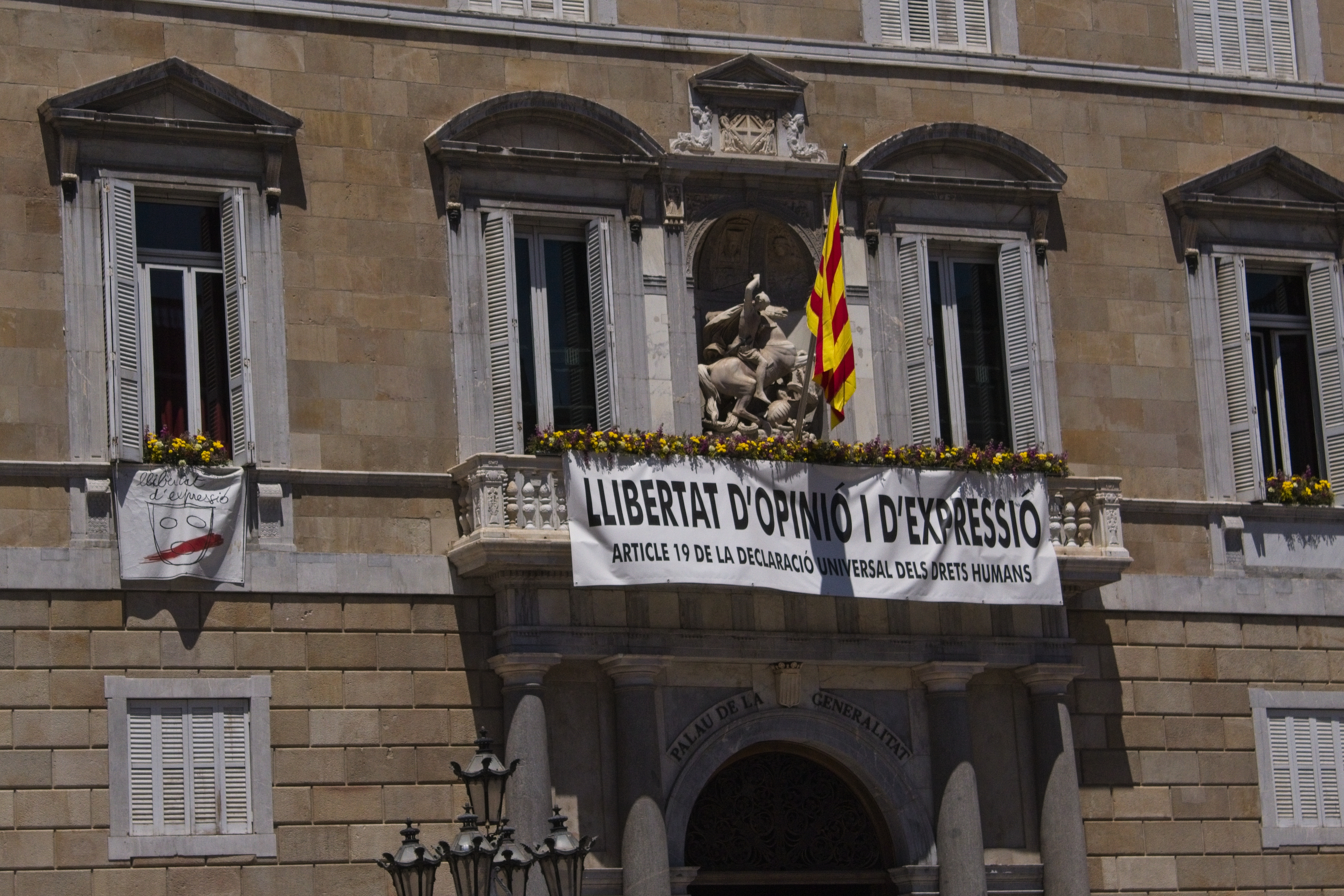 This is the Catalan government house and they were flying protest banners regarding freedom of speech, for the sake of the leaders of the referendum on independence in 2017, who have since been put in jail.