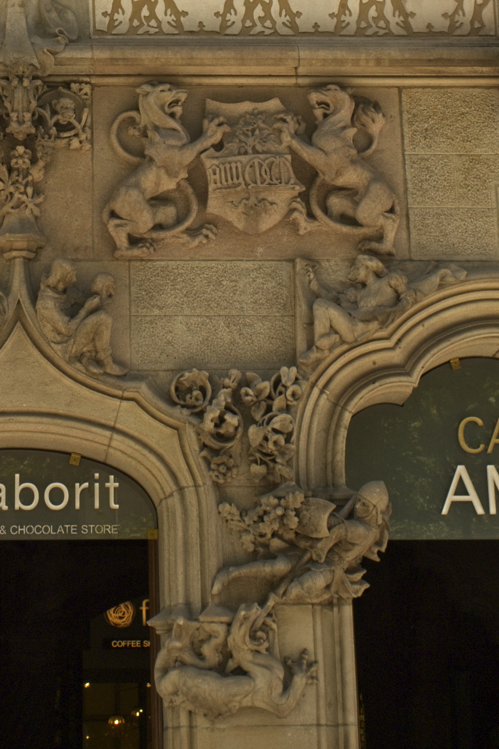Detail over the doorway of one of the buildings, depicting St. George, who is patron saint of Catalonia. This building was designed by a Neo-classicist and reflects that sort of sensibility.